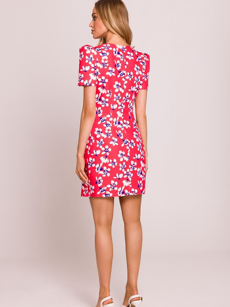 Elegancka i kobieca sukienka mini wykonana z wysokiej jakości tkaniny z kwiatowym nadrukiem. Model podkreśla talię dzięki subtelnym przeszyciom, a krótkie rękawy na poduszkach nadają jej wyjątkowego charakteru. Sukienka zapinana jest z tyłu na kryty zamek, co zapewnia komfort noszenia i estetyczne wykończenie. Brak podszewki sprawia, że jest lekka i idealna na ciepłe dni. Całość została zaprojektowana i uszyta w Polsce, z dbałością o każdy detal.
