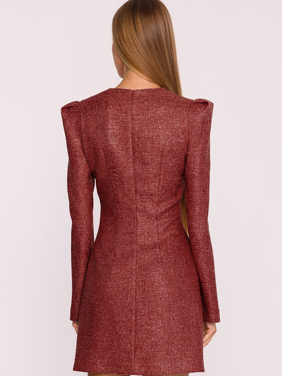 Wyjątkowa sukienka z tkaniny tweedowej w melanżowym wzorze to elegancka propozycja z nutą nowoczesnego charakteru. Strukturalny materiał pięknie układa się na sylwetce, nadając całości szyku i klasy. Model ma głęboki dekolt w kształcie litery V, który subtelnie podkreśla kobiecą sylwetkę. Długie rękawy z lekko poszerzanymi ramionami i bufkami dodają sukience wyrazistości oraz nadają jej modnego, strukturalnego charakteru. Zapięcie na kryty zamek z tyłu zapewnia wygodę i estetyczne wykończenie. Wyjątkowym detalem jest ozdobna dopinka, szyfonowa kokarda z biżuteryjnym wisiorkiem, która nadaje sukience eleganckiego, biżuteryjnego akcentu i sprawia, że prezentuje się jeszcze bardziej wyjątkowo. Fason lekko dopasowany z mocniej zaznaczoną talią podkreśla proporcje sylwetki, a mini długość dodaje całości lekkości i kobiecego uroku. Zaprojektowana i uszyta w Polsce idealna dla kobiet, które cenią klasykę z nowoczesnymi, dekoracyjnymi detalami.