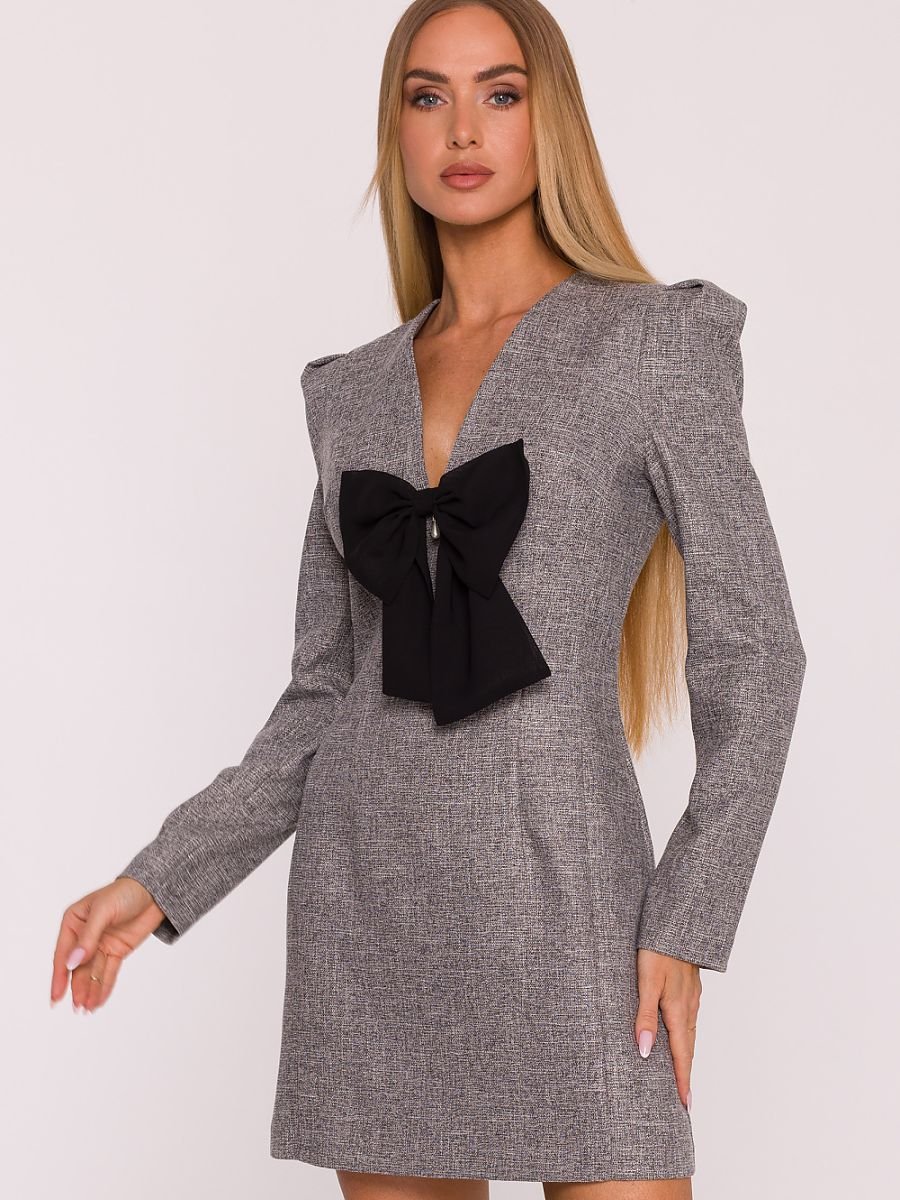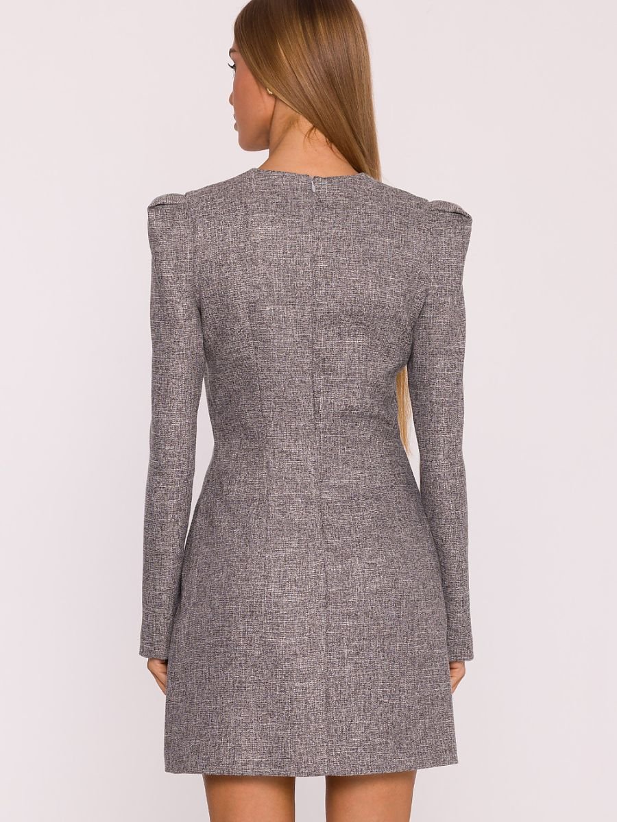 Wyjątkowa sukienka z tkaniny tweedowej w melanżowym wzorze to elegancka propozycja z nutą nowoczesnego charakteru. Strukturalny materiał pięknie układa się na sylwetce, nadając całości szyku i klasy. Model ma głęboki dekolt w kształcie litery V, który subtelnie podkreśla kobiecą sylwetkę. Długie rękawy z lekko poszerzanymi ramionami i bufkami dodają sukience wyrazistości oraz nadają jej modnego, strukturalnego charakteru. Zapięcie na kryty zamek z tyłu zapewnia wygodę i estetyczne wykończenie. Wyjątkowym detalem jest ozdobna dopinka, szyfonowa kokarda z biżuteryjnym wisiorkiem, która nadaje sukience eleganckiego, biżuteryjnego akcentu i sprawia, że prezentuje się jeszcze bardziej wyjątkowo. Fason lekko dopasowany z mocniej zaznaczoną talią podkreśla proporcje sylwetki, a mini długość dodaje całości lekkości i kobiecego uroku. Zaprojektowana i uszyta w Polsce idealna dla kobiet, które cenią klasykę z nowoczesnymi, dekoracyjnymi detalami.