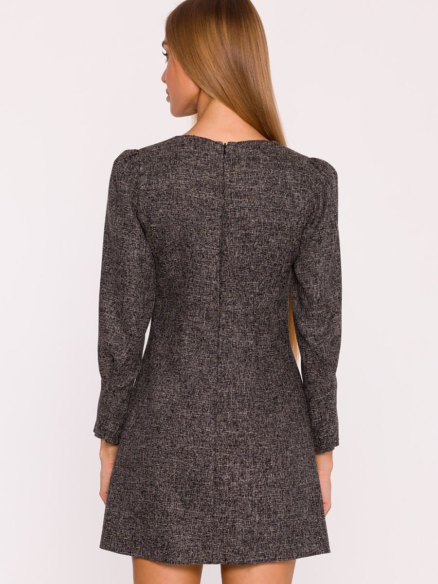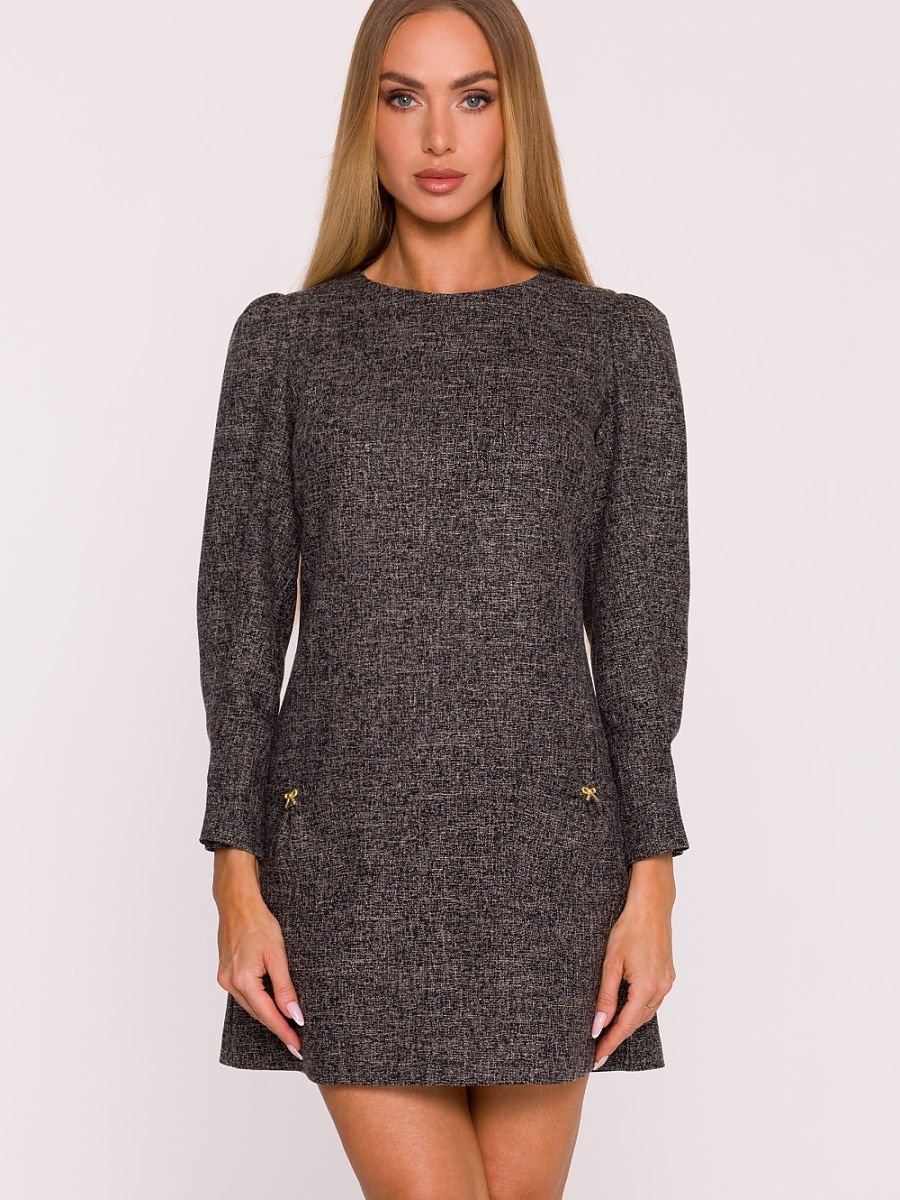 Elegancka sukienka z tkaniny tweedowej w melanżowym wzorze to propozycja łącząca klasyczny szyk z dziewczęcym wdziękiem. Strukturalny materiał pięknie układa się na sylwetce, a jego charakterystyczna faktura nadaje całości wyrazistego stylu. Model z dekoltem w kształcie łódki i długimi rękawami marszczonymi na ramionach prezentuje się subtelnie i kobieco. Zaszewki u dołu rękawów dodają im eleganckiej formy, a kryty zamek z tyłu zapewnia wygodę i estetyczne wykończenie. Na przodzie umieszczono naszywane kieszenie ozdobione biżuteryjnymi kokardkami, które przełamują klasyczną linię fasonu i wprowadzają efektowny, dekoracyjny akcent. Trapezowy krój, delikatnie dopasowany w ramionach i swobodny w biodrach, gwarantuje komfort noszenia i piękną, harmonijną sylwetkę. Mini długość nadaje sukience lekkości i nowoczesnego charakteru. Zaprojektowana i uszyta w Polsce idealna dla kobiet, które cenią elegancję z nutą oryginalnych detali.
