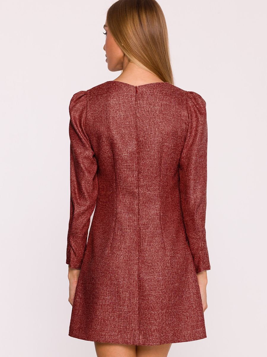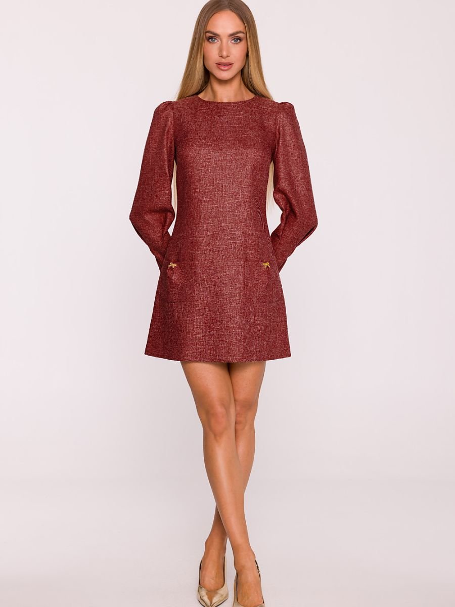 Elegancka sukienka z tkaniny tweedowej w melanżowym wzorze to propozycja łącząca klasyczny szyk z dziewczęcym wdziękiem. Strukturalny materiał pięknie układa się na sylwetce, a jego charakterystyczna faktura nadaje całości wyrazistego stylu. Model z dekoltem w kształcie łódki i długimi rękawami marszczonymi na ramionach prezentuje się subtelnie i kobieco. Zaszewki u dołu rękawów dodają im eleganckiej formy, a kryty zamek z tyłu zapewnia wygodę i estetyczne wykończenie. Na przodzie umieszczono naszywane kieszenie ozdobione biżuteryjnymi kokardkami, które przełamują klasyczną linię fasonu i wprowadzają efektowny, dekoracyjny akcent. Trapezowy krój, delikatnie dopasowany w ramionach i swobodny w biodrach, gwarantuje komfort noszenia i piękną, harmonijną sylwetkę. Mini długość nadaje sukience lekkości i nowoczesnego charakteru. Zaprojektowana i uszyta w Polsce idealna dla kobiet, które cenią elegancję z nutą oryginalnych detali.