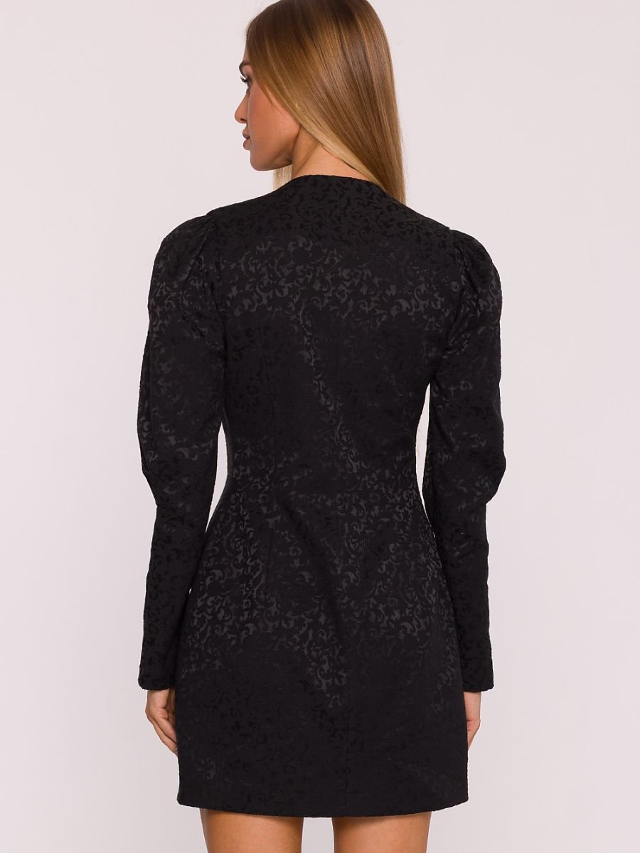 Elegancka sukienka z żakardowej tkaniny z lekko wypukłym wzorem roślinnym to propozycja, która łączy klasykę z subtelną nutą nowoczesności. Starannie dobrany materiał nadaje całości szlachetnego charakteru, a podszewka na całej długości zapewnia komfort noszenia i perfekcyjne układanie się fasonu. Model ma głęboki dekolt w kształcie litery V, który pięknie wysmukla sylwetkę i dodaje kobiecości. Długie rękawy z delikatnym bufowaniem u góry nadają elegancji i lekkości. Zapięcie z przodu, ukryte pod plisą z guzikami, podkreśla wyrafinowany charakter sukienki. Całość uzupełniają imitacje kieszeni z ozdobnymi klapkami, które dodają całości szykownego akcentu. Fason dopasowany, lekko taliowany, subtelnie podkreśla sylwetkę, łącząc wyraźnie zaznaczoną górę z prostym dołem. Mini długość nadaje kreacji nowoczesnego wyrazu, sprawiając, że doskonale sprawdzi się zarówno na wieczorne wyjścia, jak i eleganckie spotkania. Zaprojektowana i uszyta w Polsce, stworzona z myślą o kobietach, które cenią jakość, styl i ponadczasową elegancję.