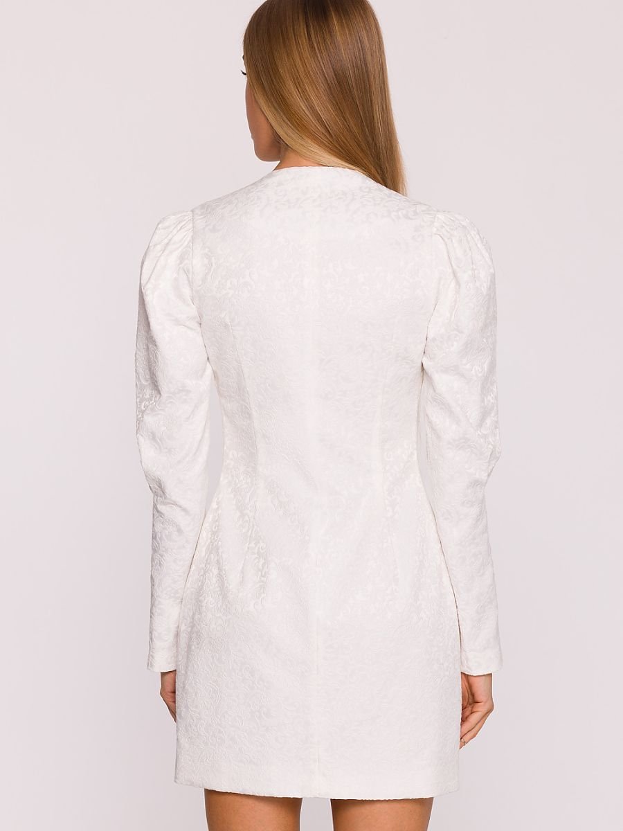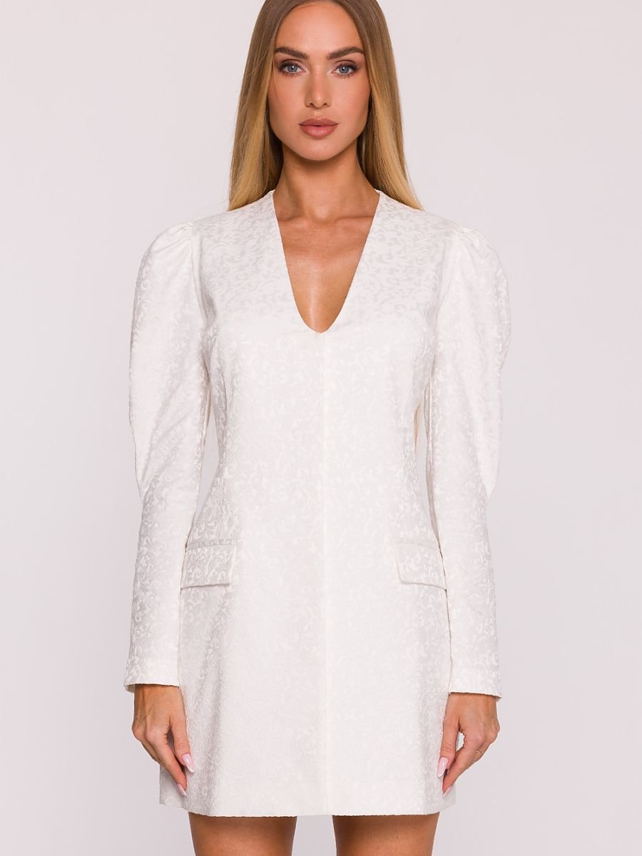 Elegancka sukienka z żakardowej tkaniny z lekko wypukłym wzorem roślinnym to propozycja, która łączy klasykę z subtelną nutą nowoczesności. Starannie dobrany materiał nadaje całości szlachetnego charakteru, a podszewka na całej długości zapewnia komfort noszenia i perfekcyjne układanie się fasonu. Model ma głęboki dekolt w kształcie litery V, który pięknie wysmukla sylwetkę i dodaje kobiecości. Długie rękawy z delikatnym bufowaniem u góry nadają elegancji i lekkości. Zapięcie z przodu, ukryte pod plisą z guzikami, podkreśla wyrafinowany charakter sukienki. Całość uzupełniają imitacje kieszeni z ozdobnymi klapkami, które dodają całości szykownego akcentu. Fason dopasowany, lekko taliowany, subtelnie podkreśla sylwetkę, łącząc wyraźnie zaznaczoną górę z prostym dołem. Mini długość nadaje kreacji nowoczesnego wyrazu, sprawiając, że doskonale sprawdzi się zarówno na wieczorne wyjścia, jak i eleganckie spotkania. Zaprojektowana i uszyta w Polsce, stworzona z myślą o kobietach, które cenią jakość, styl i ponadczasową elegancję.
