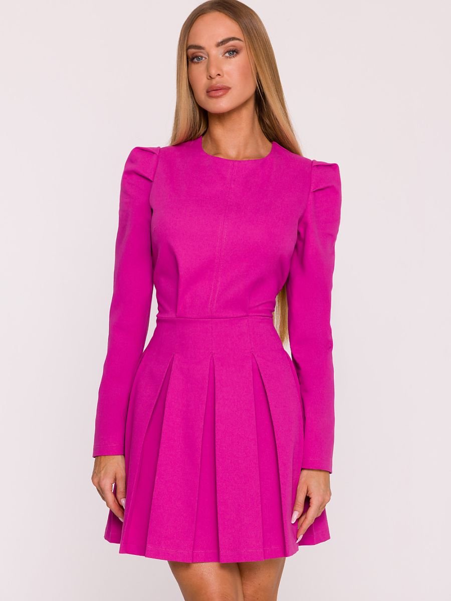 Sukienka uszyta z tkaniny imitującej denim to elegancka i nowoczesna propozycja, idealna na wiele okazji. Materiał jest lekko sztywny, matowy i delikatnie elastyczny, dzięki czemu pięknie zachowuje formę oraz podkreśla fason. Model ma klasyczny, okrągły dekolt i długie rękawy z subtelnymi zakładkami na ramionach, które nadają sylwetce wyrazistości i elegancji. Dopasowana góra płynnie przechodzi w rozkloszowany dół z kontrafałdami, tworząc kobiecą, harmonijną linię. Kryty zamek z tyłu zapewnia wygodę zakładania, a brak podszewki sprawia, że sukienka jest lekka i komfortowa w noszeniu. Fason podkreśla talię, akcentuje ramiona i pięknie modeluje sylwetkę. Mini długość nadaje całości nowoczesnego charakteru i delikatnie odsłania nogi, dzięki czemu kreacja świetnie sprawdzi się zarówno na co dzień, jak i na specjalne wyjścia. Zaprojektowana i uszyta w Polsce, z dbałością o detale i kobiecą sylwetkę.