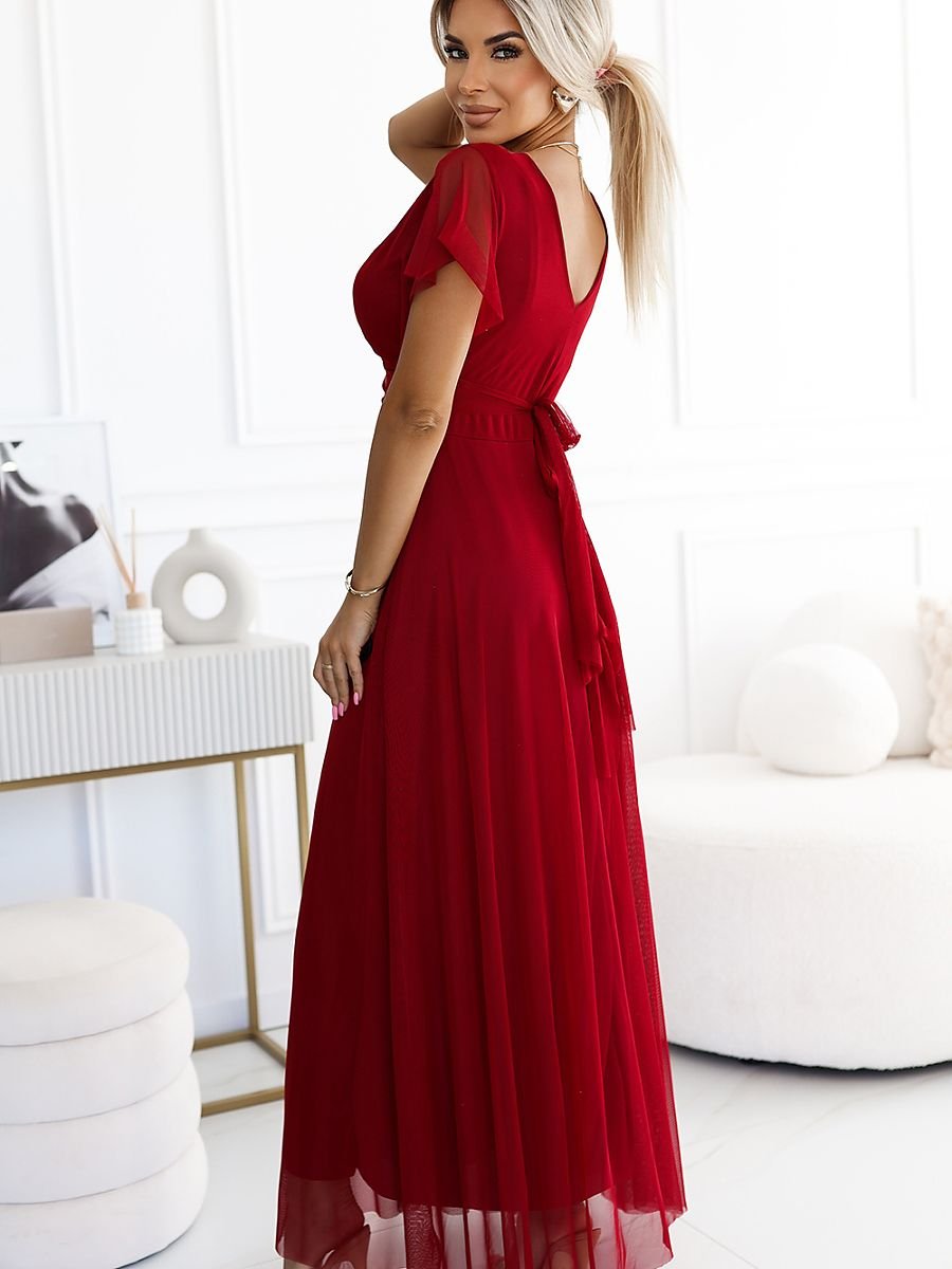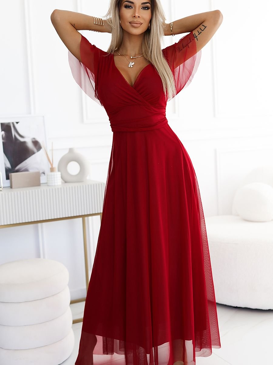 Sukienka NASTIA marki Numoco Basic to delikatna, długa kreacja z dekoltem i krótkim rękawkiem. Wykonana z lekkiego, bordowego tiulu, który dodaje jej zwiewności i lekkości. Sukienka posiada usztywniane miseczki, co zapewnia doskonałe podtrzymanie, a wiązanie w pasie subtelnie podkreśla talię. To wyjątkowa propozycja o kobiecym i romantycznym charakterze. Produkowana w Europie, łączy w sobie wysoką jakość wykonania oraz elegancki design. Idealna na wieczorne wyjścia i specjalne uroczystości.