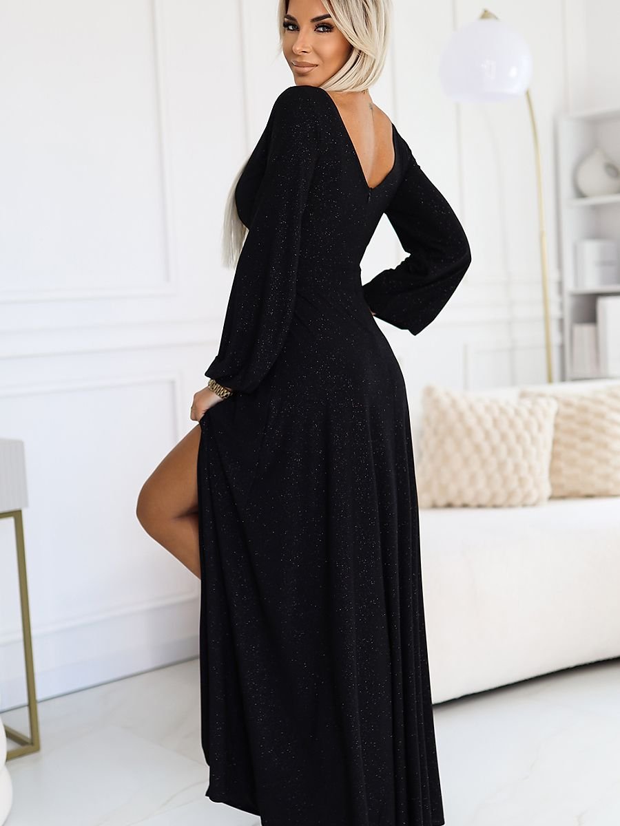 Suknia NELA marki Numoco to elegancka, długa kreacja z rozcięciem na nodze i luźnymi długimi rękawami. Sukienka posiada dekolt w kształcie litery V z przodu oraz zmysłowy dekolt na plecach. Wykonana z błyszczącego, czarnego elastycznego materiału, który doskonale podkreśla sylwetkę. Produkt polski, idealny na wyjątkowe okazje.