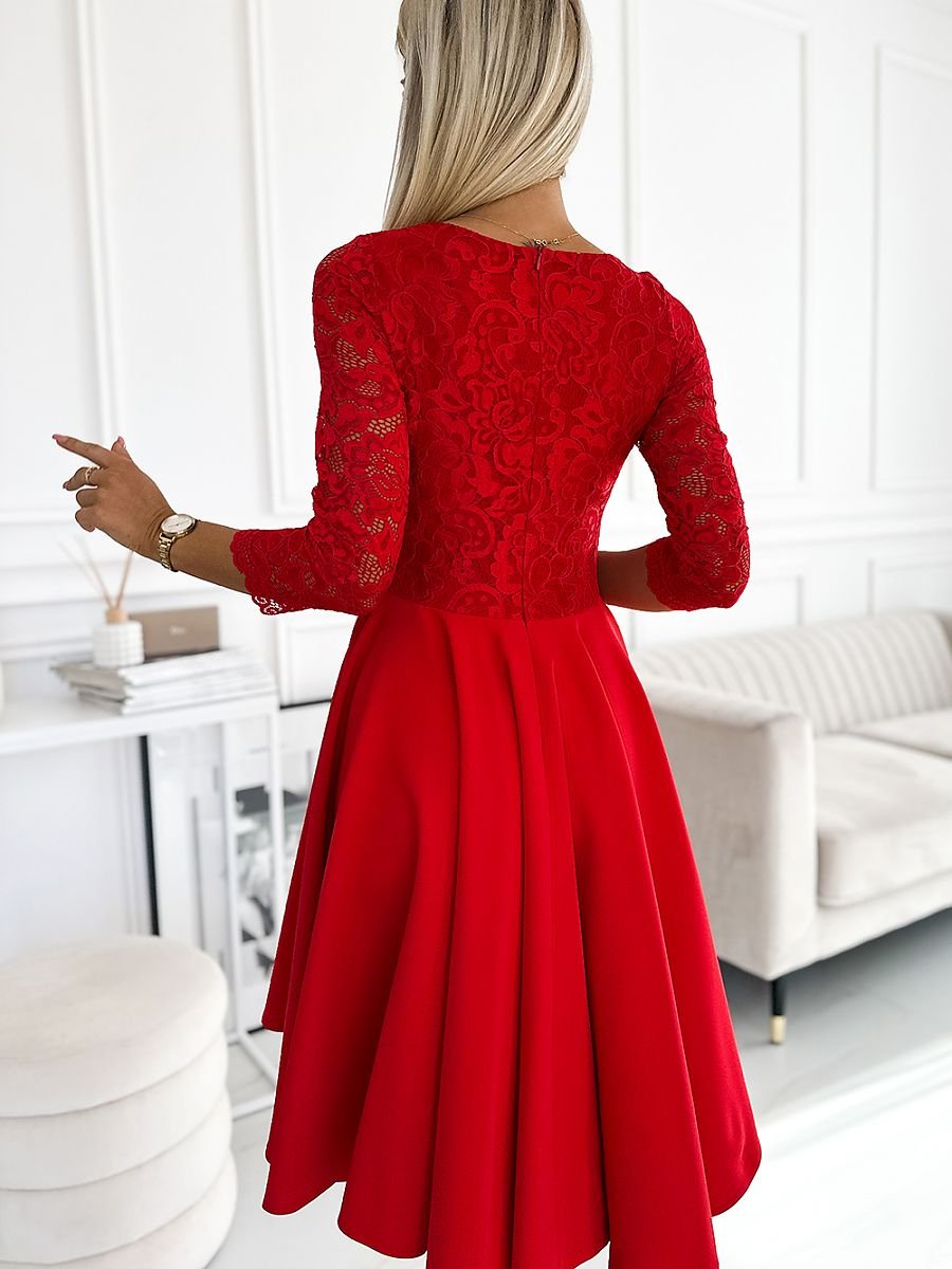Ekskluzywna czerwona asymetryczna sukienka z dłuższym tyłem, rękawkiem, dekoltem i koronką. Spódnica z dłuższym tyłem sprawdzi się idealnie w tańcu. Marka numoco. Produkcja polska.