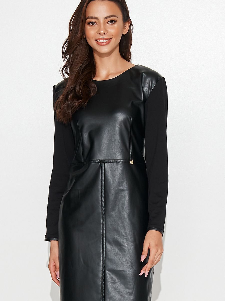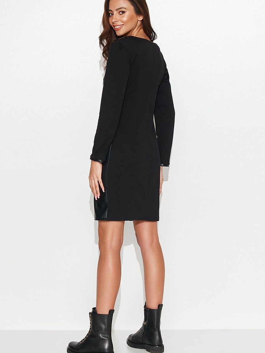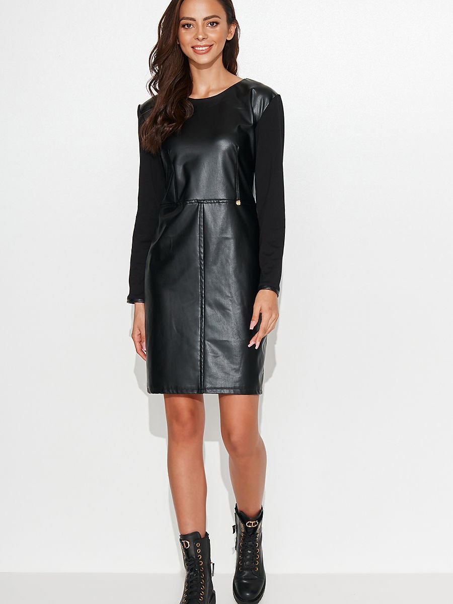 Krótka sukienka z długim rękawem. Z przodu skórzana, z tyłu dzianinowa. Rękawy również zostały wykonane z komfortowej dzianiny i zakończone skórzaną lamówką. Z przodu sukienka jest ozdobiona uroczą złotą blaszką. Model występuje w kolorze czarnym. Dekolt sukienki jest okrągły. Subtelnie odkrywa obojczyki. To kreacja dla kobiet z pazurem. Niech pozory jednak Cię nie zwiodą, sukienka jest niezwykle wygodna. Dzięki dodatkowi dzianiny z elastanem, doskonale się ją użytkuje. Przez to nadaje się zarówno na imprezę, jak i do pracy. Nawet cały dzień spędzony w biurze nie będzie Ci straszny. Sukienka jest zapinana na delikatny zamek wszyty w tylnej części. Ubierz do niej ulubione kozaki i rób niezapomniane wrażenie!