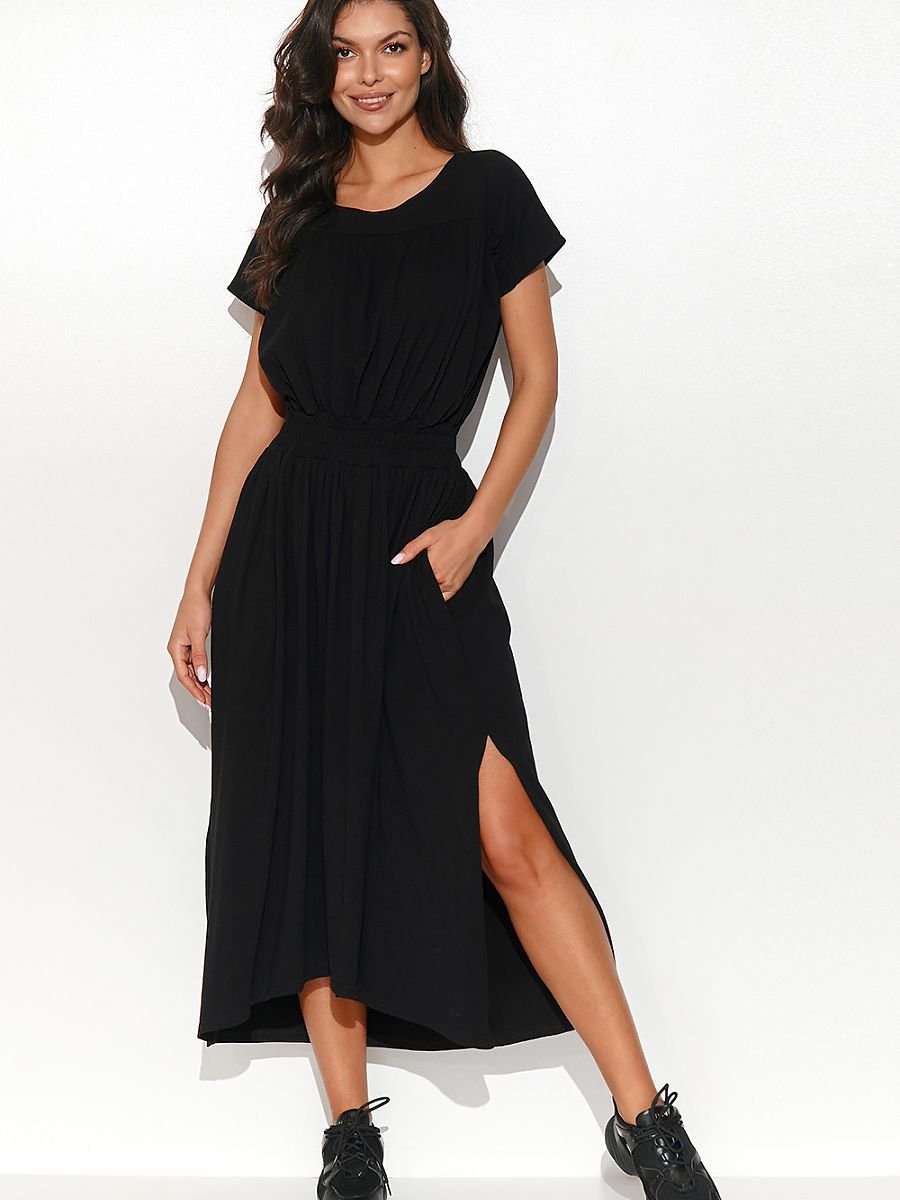 Długa sukienka asymetryczna uszyta z dzianiny dresowej. Posiada okrągły dekolt, w talii ma umieszczoną gumę ściągającą. Tył sukienki jest nieco dłuższy od przodu, dzięki czemu casualowa kreacja ciekawie prezentuje się na sylwetce. Prawie na całej długości sukienka posiada delikatne drapowania. Po bokach zostały wszyte boczne kieszenie wsuwane. Okrągły dekolt pozostawia przestrzeń na piękny łańcuszek. Z kolei krótkie rękawy maskują ramiączka od bielizny. Załóż do niej ulubione botki lub sandały i ciesz się swobodą, zadając przy okazji szyku.