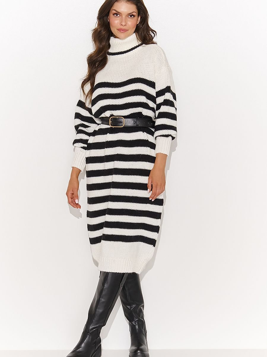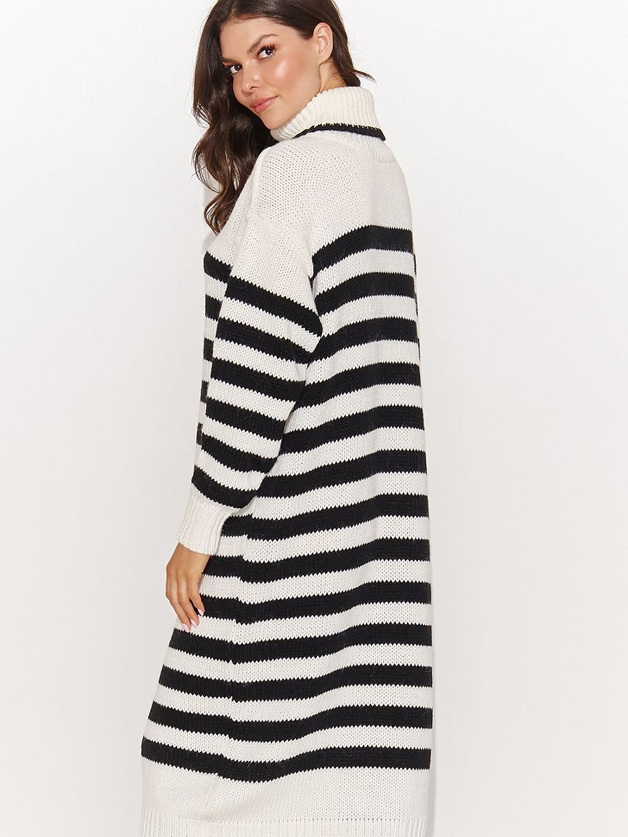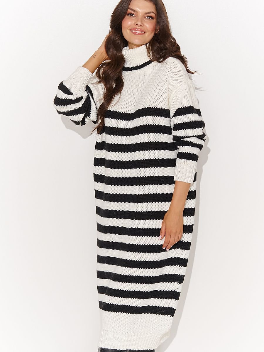 Przepiękny długi damski sweter z golfem i ozdobnymi paskami to doskonały modowy wybór, łączący wygodę i elegancję. Jego obszerny fason gwarantuje niezwykły komfort, a zarazem z powodzeniem zastępuje sukienkę. Mięsisty golf zapewnia ekspresowe uczucie ciepła, a rękawy o obszernym kroju dodają luzu stylizacji. Sweter występuje w dwóch wariantach kolorystycznych, co daje Ci możliwość dopasowania swetra do swojego stylu. Możesz nosić go swobodnie lub spiąć sweter paskiem, podkreślając swoją talię. Postaw na kobiecość w wydaniu pełnym swobody. Do swetra załóż kozaki, ulubiony płaszcz i emanuj pewnością siebie.