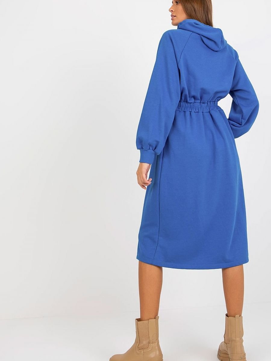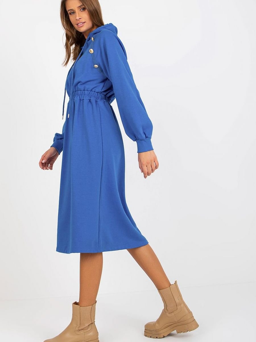 Dresowa sukienka z długim rękawem oraz kapturem. W pasie gumka, na przodzie ozdobne guziki. Propozycja na co dzień.