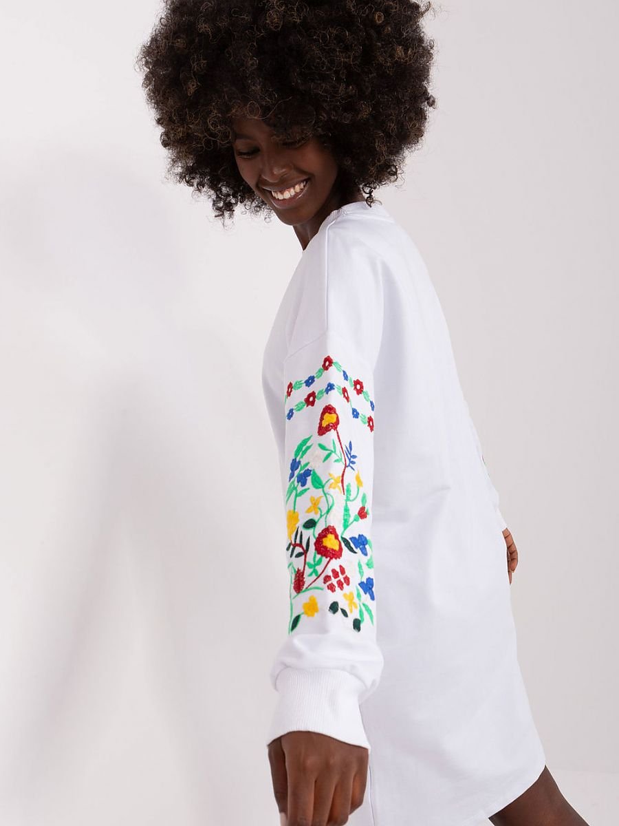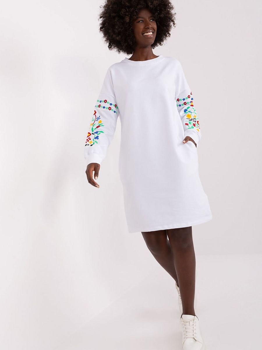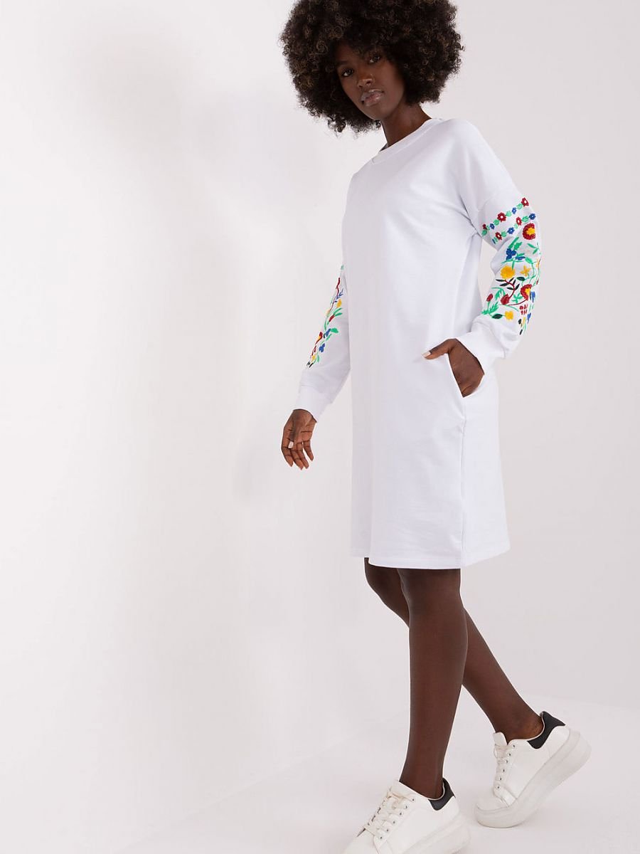 Sukienka dresowa z okrągłym dekoltem oraz długim rękawem. Rękawy ozdobione ciekawym haftem na całej długości. W szwach bocznych kieszenie wsuwane. Propozycja idealna na wiele okazji.