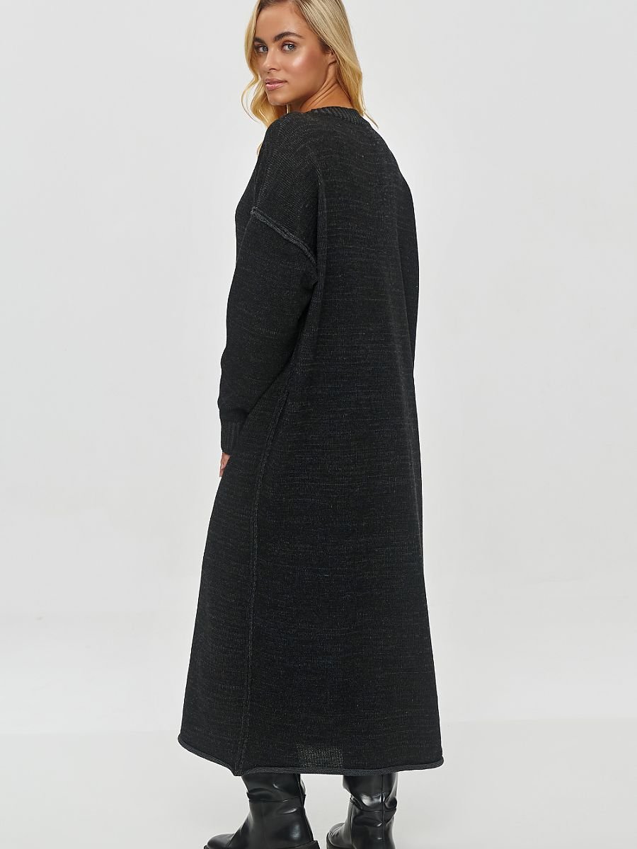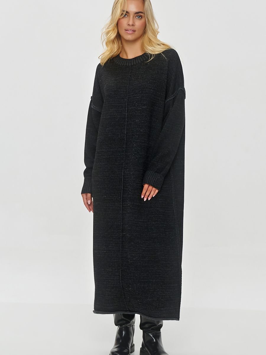 Długi sweter damski o luźnym kroju, wykonany z materiału w melanżowy wzór. Sweter ma oversizeowy fason z długimi rękawami, co dodaje mu komfortu i swobodnego stylu a obniżona linia ramion doskonale maskuje masywniejsze ramiona. Wykończony jest szerokimi ściągaczami na rękawach, dzięki którym możesz dopasować ich długość jednocześnie je bluzując. Dekolt jest zaokrąglony i wykończony ściągaczem. Sweter sięga do kostek, tworząc elegancki i oryginalny wygląd, idealny na chłodniejsze dni. Z przodu widoczny jest pionowy szew, który dodaje swetrowi subtelnego detalu i wydłuża optycznie sylwetkę. To idealny wybór na jesienne i zimowe dni, świetnie sprawdzający się w stylizacjach z wysokimi butami. Sweter łączy w sobie wygodę i styl, dzięki czemu można go nosić zarówno na co dzień, jak i na bardziej eleganckie okazje.