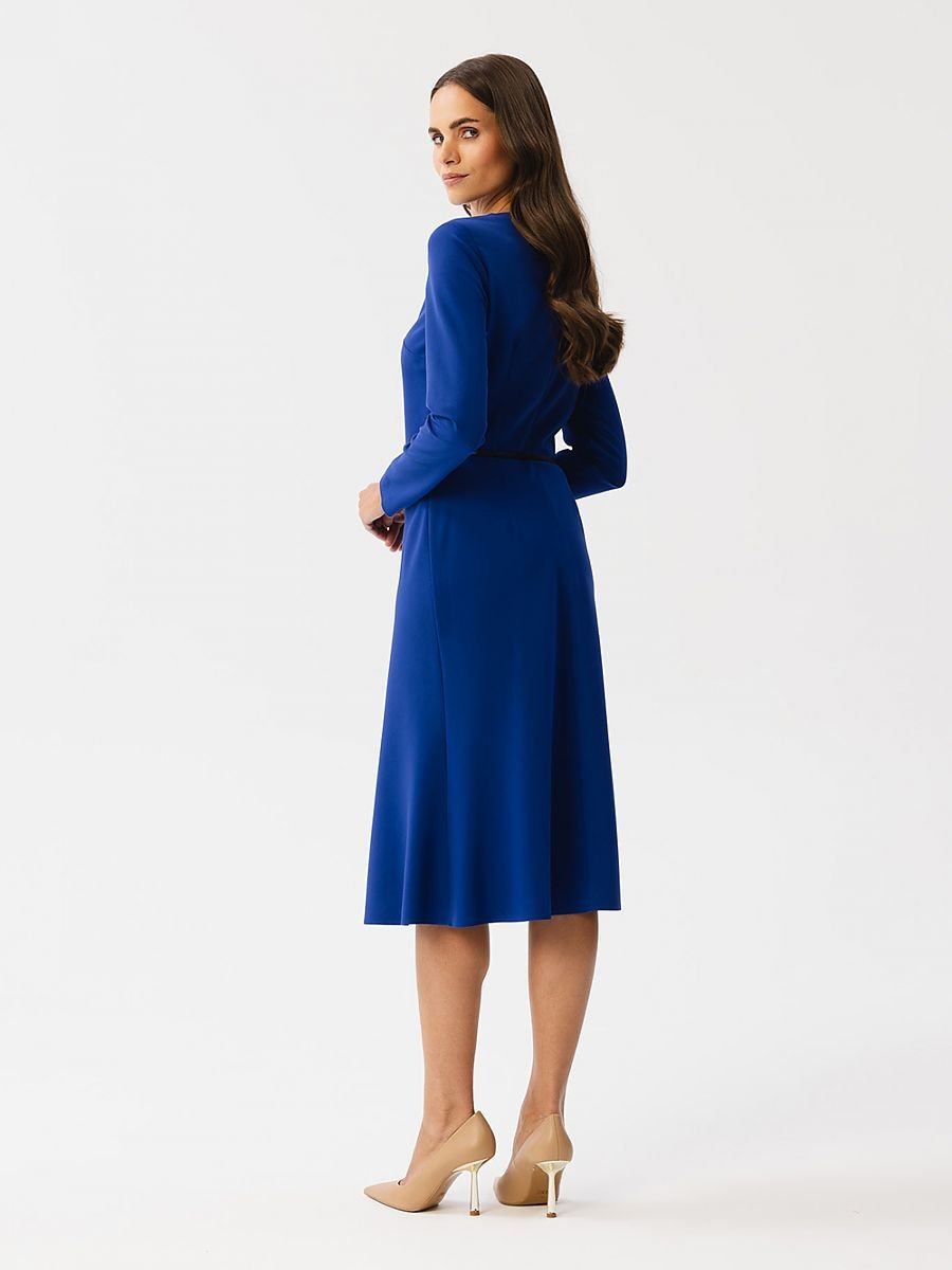 Ta sukienka wyróżnia się dekoracyjnymi przeszyciami na dekolcie, które dodają jej uroku. Odcięcie w talii podkreśla talię, a dołączony pasek ze sztucznej skóry jest stylowym dodatkiem. Długie, proste rękawy są uniwersalne i modne. Dół sukienki jest krojony ze skosu z przeszyciem przez środek, co nadaje jej lekkości. Długość za kolano sprawia, że sukienka jest odpowiednia na wiele okazji. Zamek kryty z tyłu ułatwia jej zakładanie. Sukienka jest bez podszewki, co zapewnia komfort noszenia. To sukienka, która została zaprojektowana i uszyta w Polsce, co świadczy o jej jakości i unikalności. Dodaje pewności siebie i stylu na różne okazje.