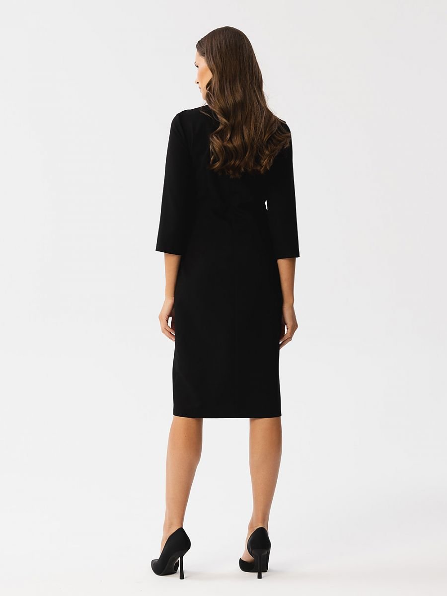 Oto urokliwa sukienka o ołówkowym fasonie, która łączy w sobie klasyczny urok z nowoczesnym stylem. Wykonana z wysokiej jakości tkaniny, jest nie tylko elegancka, ale także komfortowa. Jej okrągły dekolt dodaje jej subtelności. Modelujące przeszycia biegnące przez środek sukienki podkreślają sylwetkę i nadają jej elegancji. Rękawy długości 3/4 są uniwersalne i modne. Długość sukienki sięga za kolano, co nadaje jej wszechstronności na różne okazje. Z przodu i na boku znajduje się rozcięcie, które dodaje sukience charakteru. Kryty zamek z tyłu ułatwia jej zakładanie. Sukienka nie posiada podszewki, co sprawia, że jest lekka i komfortowa w noszeniu. To sukienka, która została zaprojektowana i uszyta w Polsce, co świadczy o jej jakości i unikalności. To doskonały wybór na wiele okazji, od formalnych spotkań po bardziej relaksujące wydarzenia, dodając Ci pewności siebie i stylu.