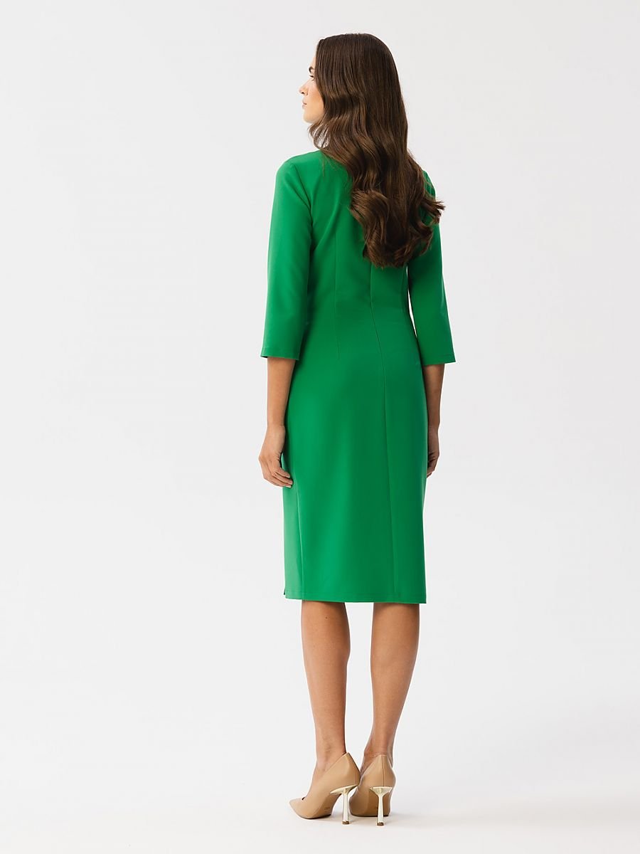 Oto urokliwa sukienka o ołówkowym fasonie, która łączy w sobie klasyczny urok z nowoczesnym stylem. Wykonana z wysokiej jakości tkaniny, jest nie tylko elegancka, ale także komfortowa. Jej okrągły dekolt dodaje jej subtelności. Modelujące przeszycia biegnące przez środek sukienki podkreślają sylwetkę i nadają jej elegancji. Rękawy długości 3/4 są uniwersalne i modne. Długość sukienki sięga za kolano, co nadaje jej wszechstronności na różne okazje. Z przodu i na boku znajduje się rozcięcie, które dodaje sukience charakteru. Kryty zamek z tyłu ułatwia jej zakładanie. Sukienka nie posiada podszewki, co sprawia, że jest lekka i komfortowa w noszeniu. To sukienka, która została zaprojektowana i uszyta w Polsce, co świadczy o jej jakości i unikalności. To doskonały wybór na wiele okazji, od formalnych spotkań po bardziej relaksujące wydarzenia, dodając Ci pewności siebie i stylu.