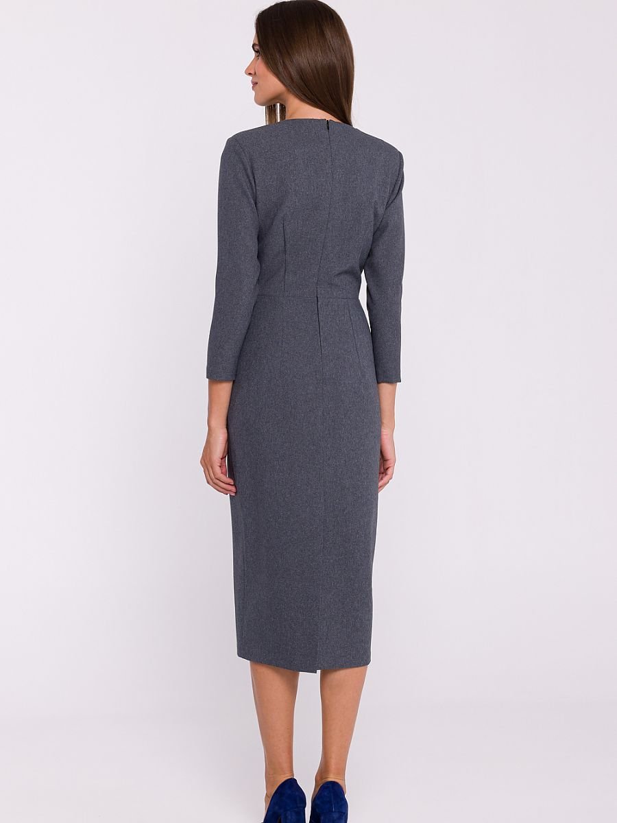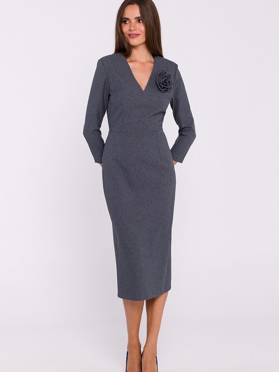 Elegancka sukienka z tkaniny o prostym, ołówkowym fasonie, odcinana w pasie, która subtelnie podkreśla sylwetkę. Dekolt w kształcie litery V dodaje szyku i wysmukla optycznie linię szyi. Długość midi zapewnia klasyczny wygląd, idealny zarówno na formalne, jak i codzienne okazje. Sukienka jest wyposażona w kryty zamek z boku oraz podszewkę, co zapewnia komfort i perfekcyjne dopasowanie. Dodatkowym, ozdobnym akcentem jest dopinany kwiatek na piersi, który dodaje jej oryginalności. Zaprojektowana i uszyta w Polsce, stanowi doskonały wybór dla kobiet ceniących styl i elegancję.
