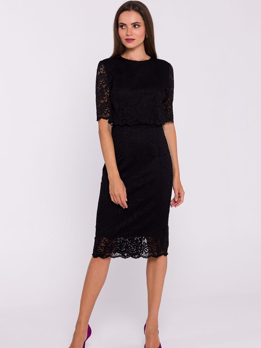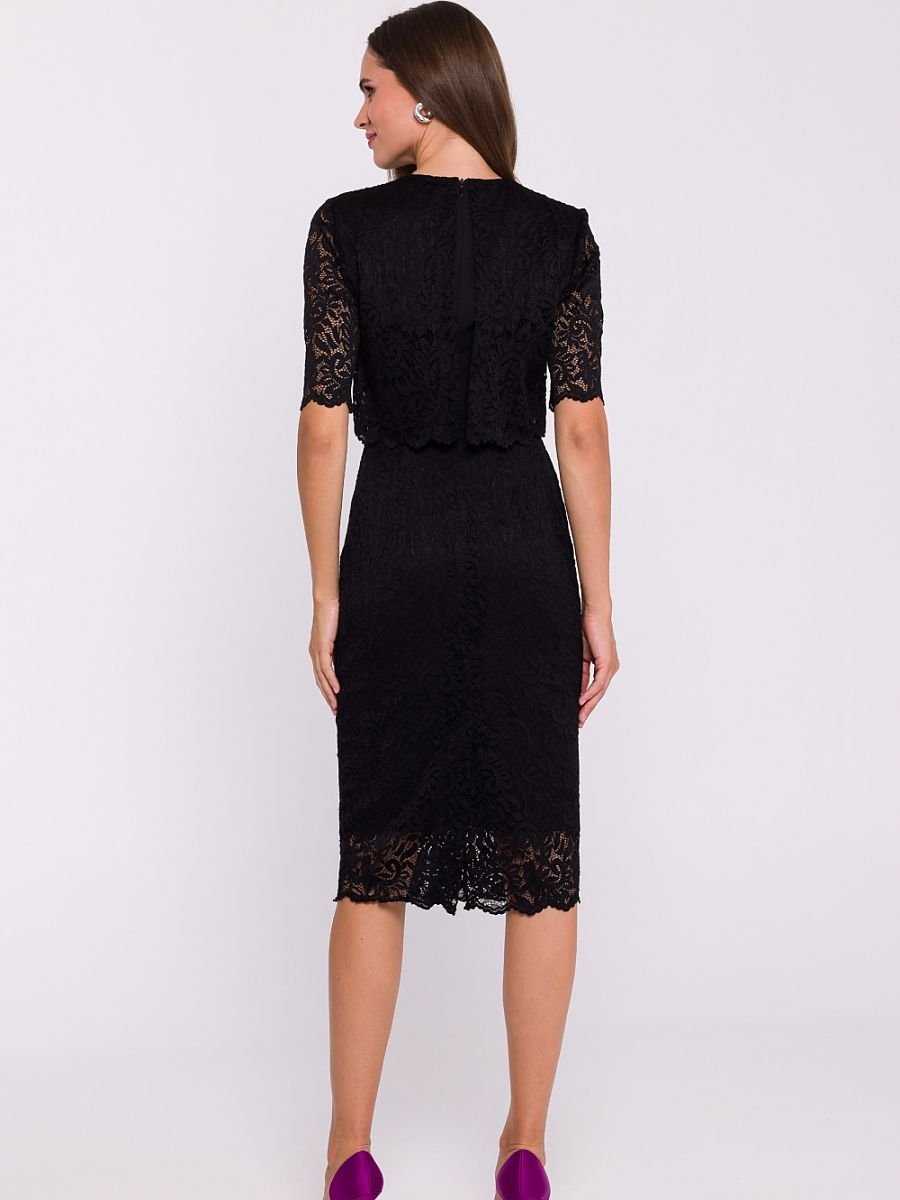 Elegancka sukienka ołówkowa, dwuwarstwowa, która łączy klasyczną gładką tkaninę na spodzie z delikatną, koronkową warstwą zewnętrzną, tworząc szykowny i kobiecy look. Sukienka jest odcinana w pasie, co podkreśla talię i nadaje sylwetce proporcji. Krótkie rękawy z koronki dodają lekkości i subtelnego uroku. Długość za kolano oraz rozcięcie z tyłu zapewniają wygodę i swobodę ruchów, podkreślając jednocześnie elegancki charakter stylizacji. Zamek kryty z tyłu pozwala na dyskretne dopasowanie do figury. Sukienka została zaprojektowana i uszyta w Polsce, gwarantując najwyższą jakość wykonania i dbałość o szczegóły. Idealna na wyjątkowe okazje, kiedy chcesz wyglądać elegancko i z klasą.