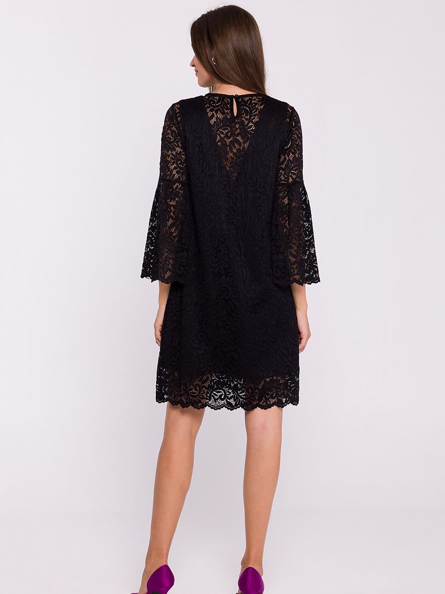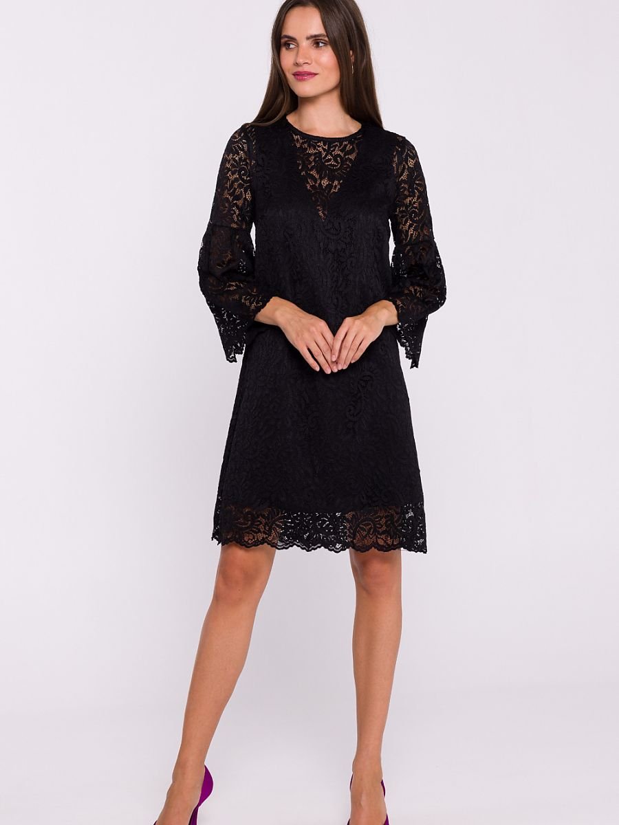 Wyjątkowa trapezowa sukienka dwuwarstwowa, która łączy klasyczną elegancję z romantycznymi detalami. Wykonana z gładkiej tkaniny na spodzie, a zewnętrzna warstwa to delikatna koronka, która nadaje całości subtelny i wyrafinowany wygląd. Rękawy sięgające za łokcie zakończone są uroczą falbanką, wprowadzając lekkość i kobiecy akcent. Sukienka o długości przed kolano zapewnia komfort i swobodę ruchów. Zakładana przez głowę, z tyłu posiada dyskretne zapięcie, które ułatwia zakładanie. Zaprojektowana i uszyta w Polsce, zachwyca jakością wykonania oraz dbałością o detale. Idealna na wyjątkowe okazje, gdy chcesz poczuć się stylowo i elegancko.