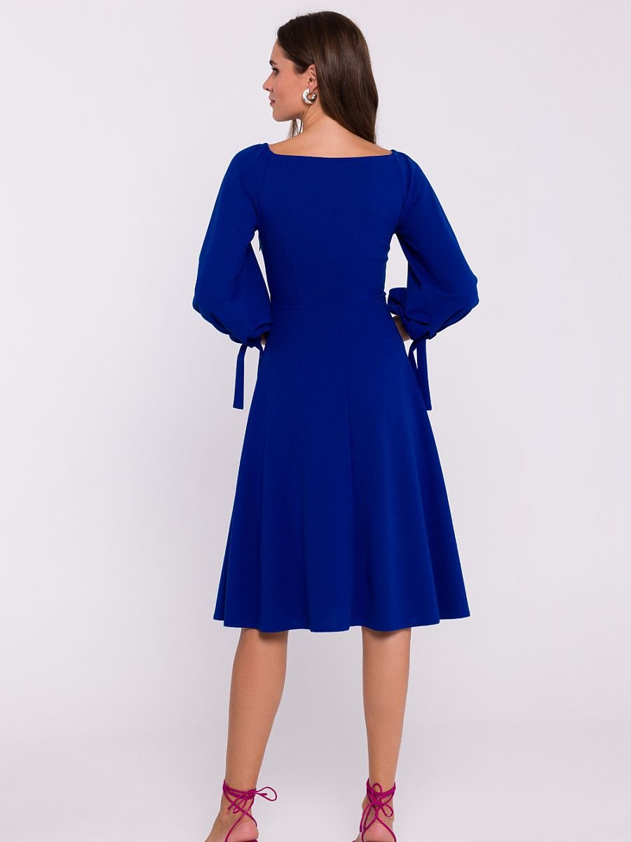 Romantyczna sukienka wykonana z miękkiej dzianiny, łączy kobiecy styl z wyjątkowym komfortem noszenia. Góra o kopertowym kroju pięknie podkreśla dekolt w kształcie litery V, z opcją opuszczenia na ramiona, co nadaje zmysłowego i subtelnego wyglądu. Na ramionach wszyte są elastyczne wstawki z gumy, które zapewniają wygodę i stabilność. Bufiaste rękawy zakończone regulowanym wiązaniem pozwalają na dostosowanie długości do indywidualnych preferencji. Sukienka nie posiada podszewki, dzięki czemu jest lekka i przewiewna, a kryty zamek z tyłu zapewnia estetyczne dopasowanie. Długość za kolano sprawia, że jest idealna na różne okazje. Zaprojektowana i uszyta w Polsce, zachwyca jakością wykonania i dbałością o detale.
