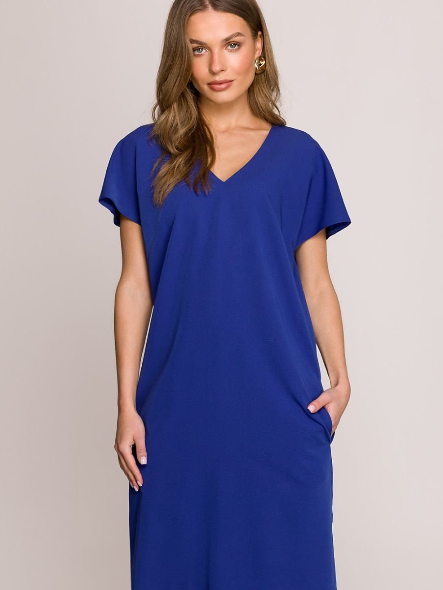 Sukienka o luźnym fasonie, który zapewnia swobodę ruchów i komfort przez cały dzień. Długość w kolano sprawia, że jest to uniwersalny wybór na wiele okazji. Krótkie rękawy dodają lekkości, idealnie sprawdzając się w cieplejsze dni. Dekolt w kształcie litery V subtelnie eksponuje szyję, nadając sukience kobiecego charakteru. Kryty zamek z tyłu zapewnia wygodę w zakładaniu, a dodatkowy rozporek na dole z tyłu wprowadza odrobinę eleganckiego akcentu. Sukienka jest bez podszewki, co czyni ją jeszcze bardziej przewiewną i wygodną. Zaprojektowana i uszyta w Polsce, co gwarantuje wysoką jakość wykonania oraz dbałość o detale. To doskonały wybór dla kobiet ceniących styl, wygodę i elegancję w codziennych stylizacjach.