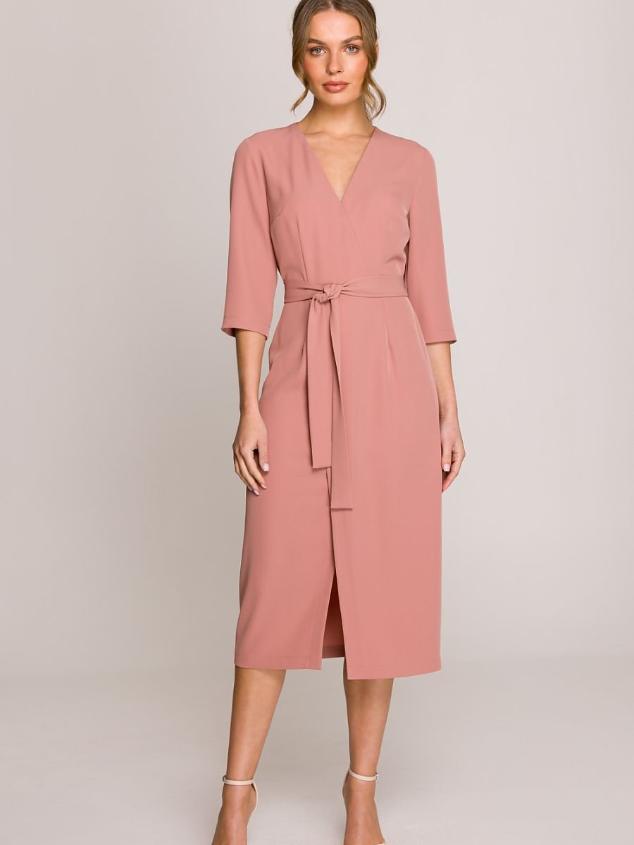 Elegancka i kobieca sukienka midi o dopasowanym kroju, który pięknie podkreśla sylwetkę. Góra z dekoltem w kształcie litery V, częściowo na podszewce, dodaje subtelnej lekkości, a rękawy o długości 3/4 nadają klasycznego charakteru. Dół z motywem kopertowym zapewnia swobodę ruchu i wysmukla sylwetkę. Z tyłu w talii wszyta została elastyczna guma, która dopasowuje się do figury, a dodatkowy wiązany pasek pozwala na podkreślenie talii według własnych preferencji. Sukienka zapinana na kryty zamek z boku, co zapewnia estetyczne wykończenie. Model zaprojektowany i uszyty w Polsce, z dbałością o każdy detal. Idealna na wyjątkowe okazje i eleganckie wyjścia.