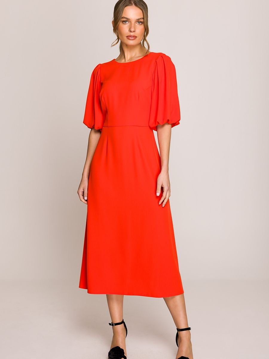 Romantyczna i kobieca sukienka midi o lekko rozkloszowanym fasonie, który pięknie układa się w ruchu. Klasyczny okrągły dekolt z przodu oraz subtelne wycięcie w kształcie litery V z tyłu dodają jej elegancji. Krótkie bufiaste rękawy na podszewce nadają sukience delikatnego, stylowego charakteru. Góra również została podszyta, co zapewnia komfort noszenia i idealne dopasowanie. Model zapinany na kryty zamek z tyłu, dzięki czemu całość prezentuje się niezwykle estetycznie. Sukienka zaprojektowana i uszyta w Polsce, z dbałością o każdy detal. Idealna na wyjątkowe okazje, jak i na co dzień w stylu pełnym klasy.
