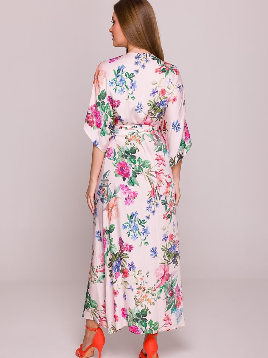 Ta zwiewna sukienka wykonana jest z lekkiej, przewiewnej wiskozy ozdobionej delikatnym, kwiatowym wzorem, który dodaje jej romantycznego charakteru. Swobodny fason z rozkloszowanym dołem oraz wiązanie w talii pozwalają na wygodne dopasowanie i podkreślenie sylwetki. Dekolt w kształcie litery V subtelnie eksponuje szyję, a luźne rękawy sięgające przed łokieć zapewniają komfort i swobodę ruchów. Sukienka nie posiada podszewki ani kieszeni, co podkreśla jej lekkość i naturalny styl. Z przodu znajduje się efektowne rozcięcie, które dodaje całości elegancji i lekkości. Zaprojektowana i uszyta w Polsce, idealna na ciepłe dni, zarówno na co dzień, jak i na wyjątkowe okazje.