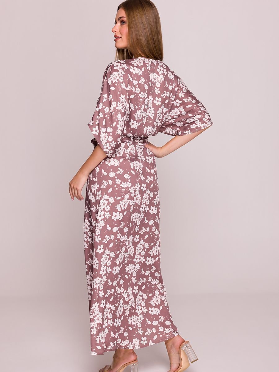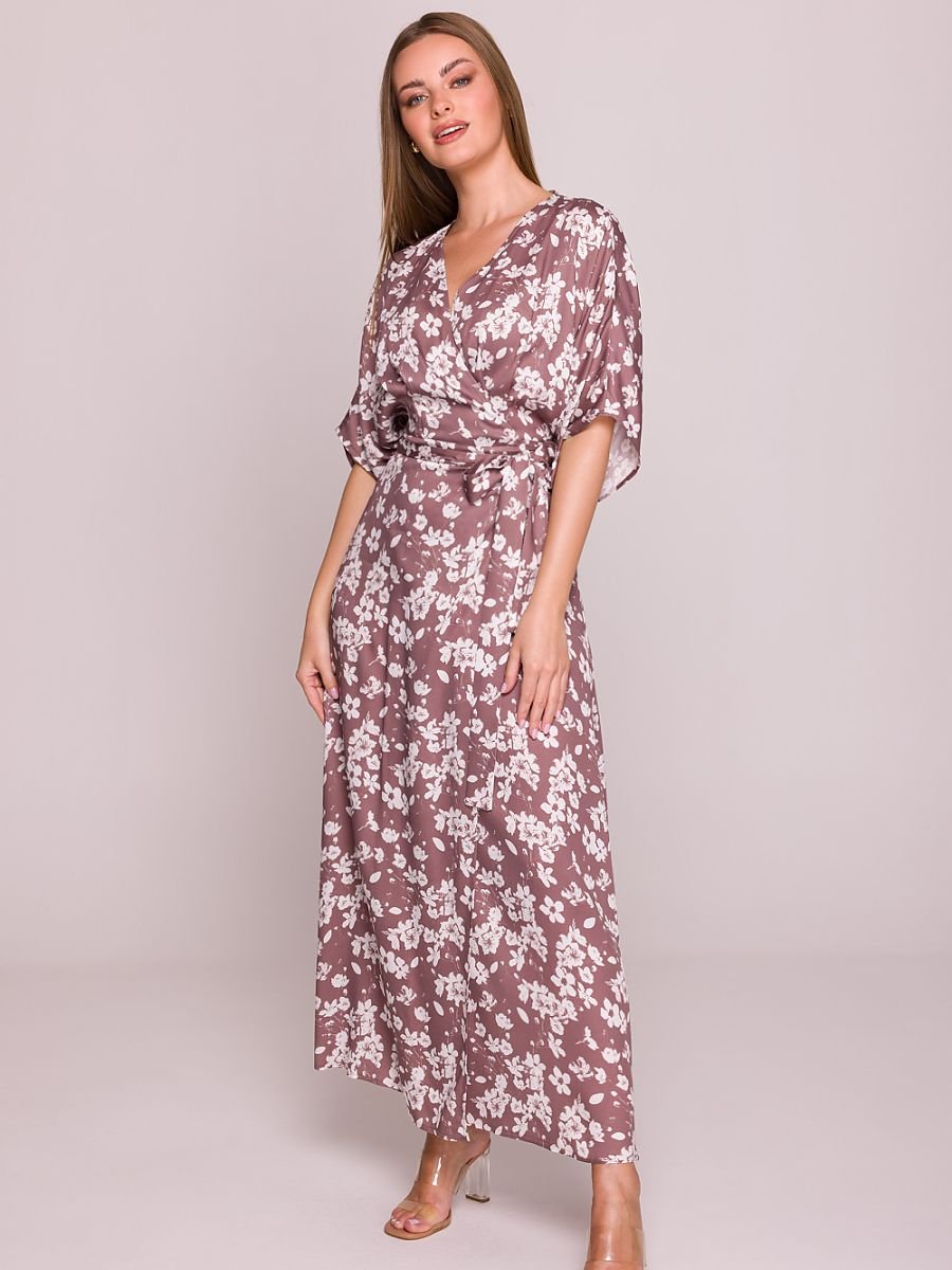 Ta zwiewna sukienka wykonana jest z lekkiej, przewiewnej wiskozy ozdobionej delikatnym, kwiatowym wzorem, który dodaje jej romantycznego charakteru. Swobodny fason z rozkloszowanym dołem oraz wiązanie w talii pozwalają na wygodne dopasowanie i podkreślenie sylwetki. Dekolt w kształcie litery V subtelnie eksponuje szyję, a luźne rękawy sięgające przed łokieć zapewniają komfort i swobodę ruchów. Sukienka nie posiada podszewki ani kieszeni, co podkreśla jej lekkość i naturalny styl. Z przodu znajduje się efektowne rozcięcie, które dodaje całości elegancji i lekkości. Zaprojektowana i uszyta w Polsce, idealna na ciepłe dni, zarówno na co dzień, jak i na wyjątkowe okazje.