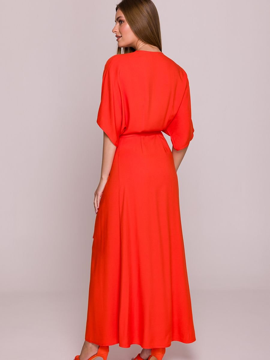Ta lekka i zwiewna sukienka została uszyta z wysokiej jakości wiskozy, której satynowe wykończenie nadaje jej delikatny, subtelny połysk. Swobodny fason z rozkloszowanym dołem podkreśla kobiecą sylwetkę, a wiązanie w talii pozwala na idealne dopasowanie i podkreślenie kształtów. Dekolt w kształcie litery V subtelnie eksponuje szyję, a luźne rękawy sięgające przed łokieć zapewniają komfort noszenia i swobodę ruchów. Sukienka jest pozbawiona podszewki i kieszeni, co podkreśla jej lekkość i minimalistyczny charakter. Przód ozdabia efektowne rozcięcie, które dodaje stylizacji nuty lekkości i zmysłowości. Produkt zaprojektowany i uszyty w Polsce, łączący w sobie wygodę i elegancję, idealny na letnie dni i wieczorne wyjścia.