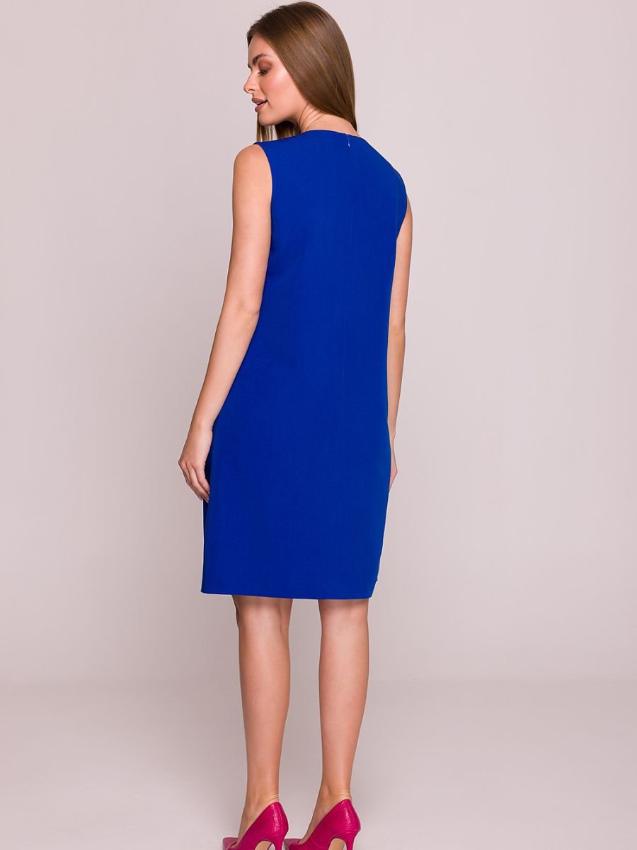 Elegancka sukienka wykonana z gładkiej, lekko elastycznej tkaniny z satynowym wykończeniem, która delikatnie lśni i nadaje całości wyjątkowego charakteru. Model z okrągłym dekoltem pod szyję ozdobionym metalowym detalem, który dodaje subtelnej elegancji. Sukienka bez rękawów, zapinana na kryty zamek z tyłu, co zapewnia wygodę noszenia i minimalistyczny wygląd. Fason prosty, trapezowy, swobodny i nieopinający sylwetki, idealny na co dzień i do biura. Sukienka ma podszewkę, która zwiększa komfort i trwałość ubrania. Długość przed kolano podkreśla kobiecą sylwetkę, jednocześnie zapewniając swobodę ruchów. Zaprojektowano i uszyto w Polsce.