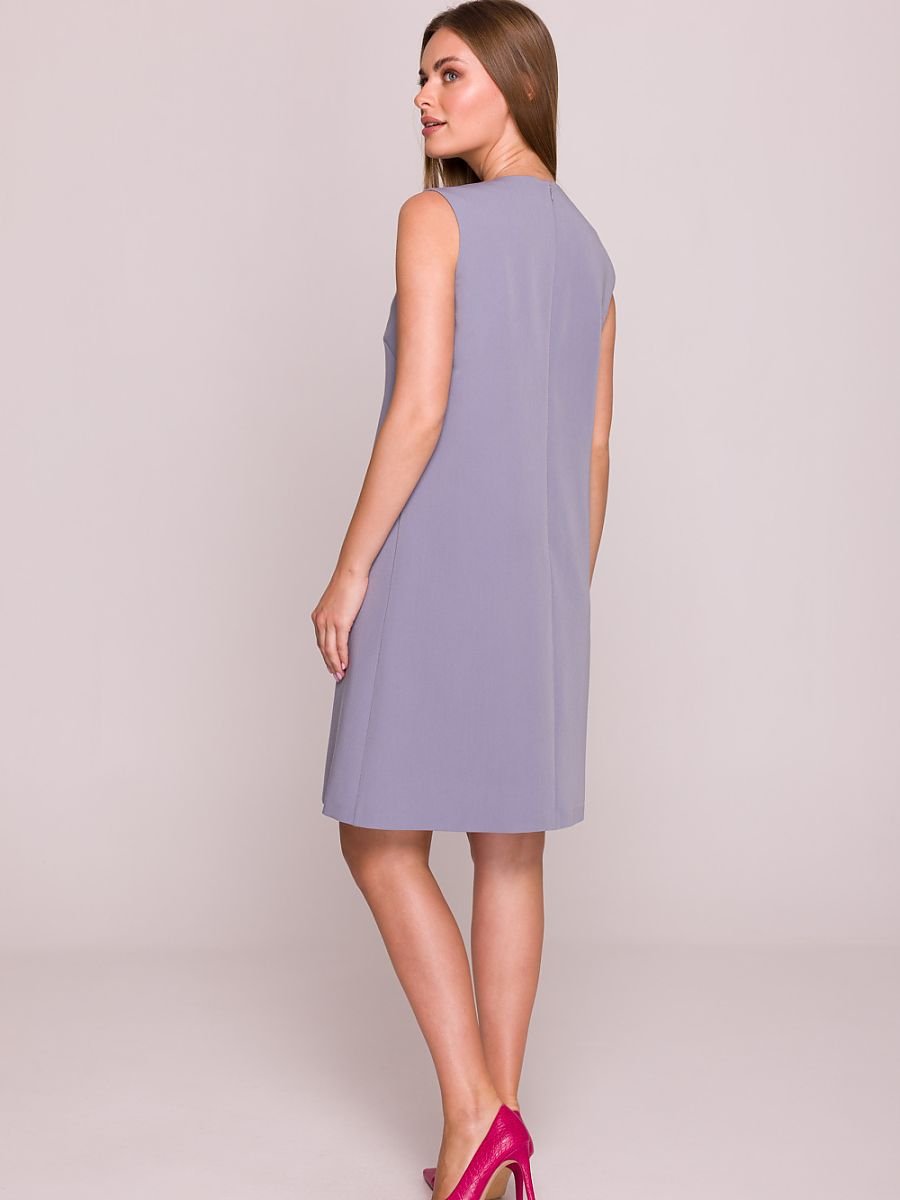 Elegancka sukienka wykonana z gładkiej, lekko elastycznej tkaniny z satynowym wykończeniem, która delikatnie lśni i nadaje całości wyjątkowego charakteru. Model z okrągłym dekoltem pod szyję ozdobionym metalowym detalem, który dodaje subtelnej elegancji. Sukienka bez rękawów, zapinana na kryty zamek z tyłu, co zapewnia wygodę noszenia i minimalistyczny wygląd. Fason prosty, trapezowy, swobodny i nieopinający sylwetki, idealny na co dzień i do biura. Sukienka ma podszewkę, która zwiększa komfort i trwałość ubrania. Długość przed kolano podkreśla kobiecą sylwetkę, jednocześnie zapewniając swobodę ruchów. Zaprojektowano i uszyto w Polsce.