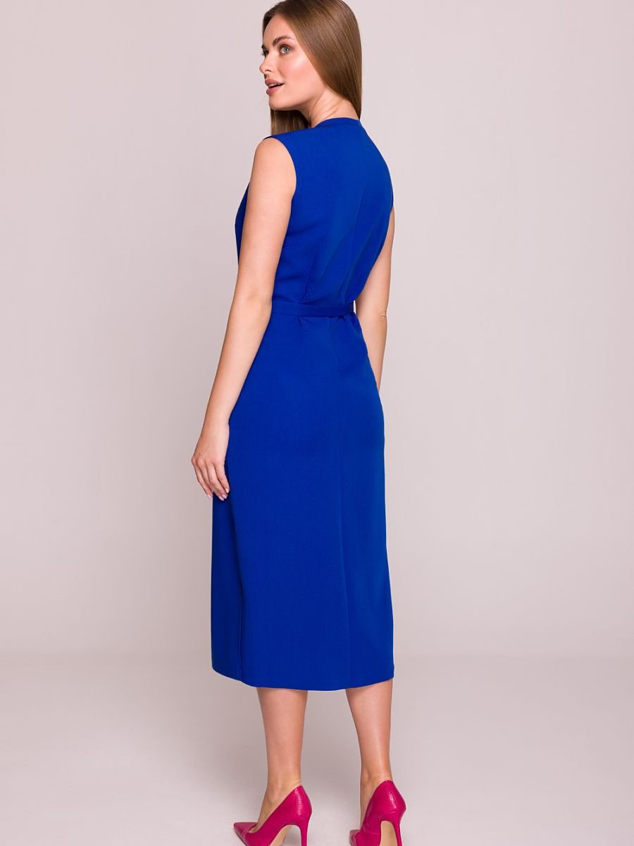 Odkryj elegancję i komfort w jednym, dzięki tej wyjątkowej sukience midi. Zaprojektowana i uszyta w Polsce, łączy w sobie klasyczny styl z nowoczesnymi detalami, idealnie wpisując się w potrzeby współczesnej kobiety. Sukienka wykonana jest z gładkiej, lekko elastycznej tkaniny z satynowym wykończeniem, która pięknie układa się na sylwetce, zapewniając komfort noszenia. Jej prosty fason z lekko podkreśloną talią oraz kształt lekkiego trapezu gwarantują elegancki wygląd i swobodę ruchów. Długość midi, sięgająca za kolano, nadaje jej uniwersalnego charakteru. Dekolt w kształcie litery V z wiązaniem na dole dodaje sukience subtelnej zmysłowości i pozwala na indywidualne dopasowanie. Brak rękawów sprawia, że jest to idealny wybór na cieplejsze dni. Praktyczne rozcięcie na boku nie tylko ułatwia poruszanie się, ale również dodaje kreacji nuty pikanterii. W talii znajduje się materiałowy pasek z elegancką klamerką, który perfekcyjnie podkreśla talię. Sukienka zapinana jest na kryty zamek umieszczony z boku, co zapewnia łatwe zakładanie i niewidoczne wykończenie. Brak podszewki sprawia, że jest lekka i przewiewna. Decydując się na ten model, wspierasz polskie rzemiosło i jakość wykonania.