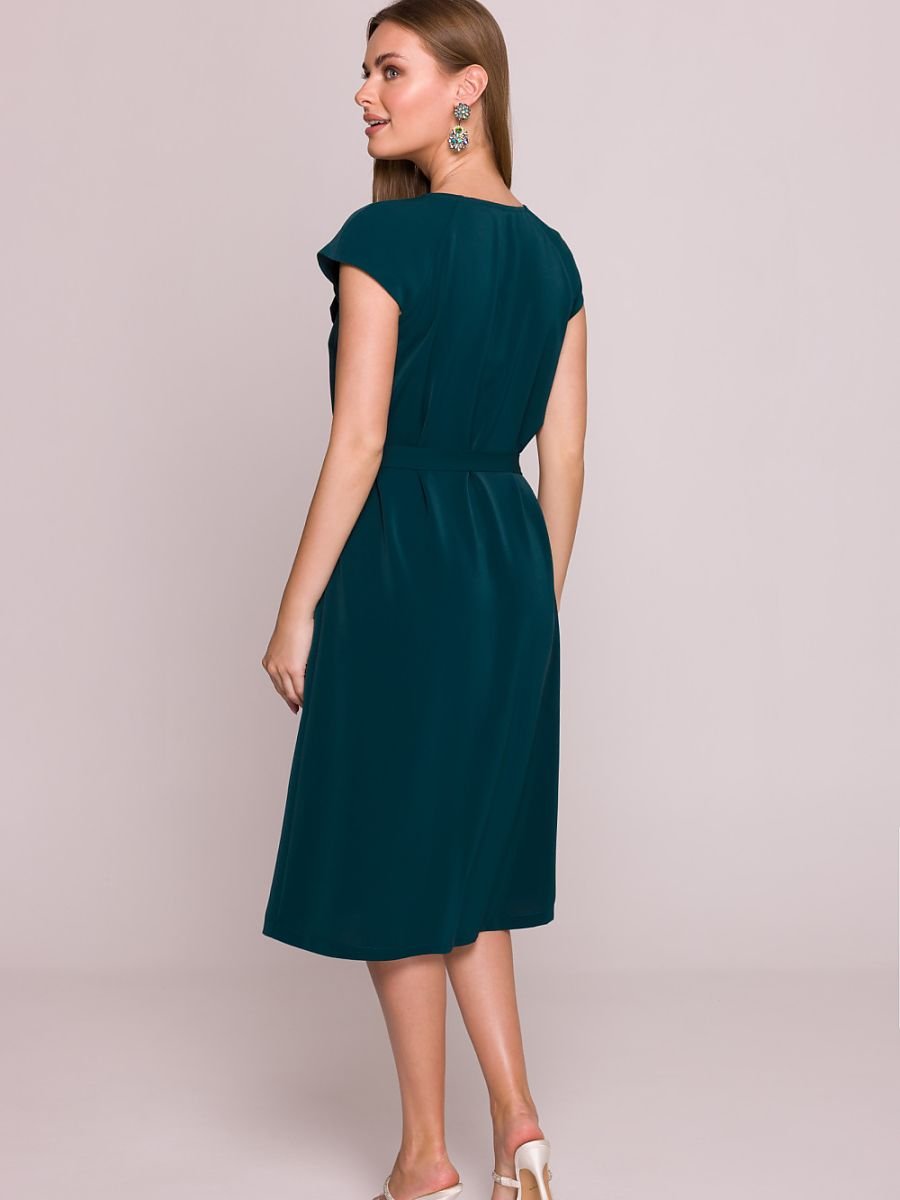 Elegancka sukienka o delikatnie rozkloszowanym fasonie w kształcie litery A, sięgająca midi, tuż do lub lekko za kolana. Wykonana z gładkiego materiału z subtelnym połyskiem, który dodaje jej wyjątkowego blasku. Dekolt w kształcie litery V ozdobiony jest dekoracyjną falbaną, która podkreśla kobiecość i nadaje lekkości. Krótki, opadający rękaw świetnie dopełnia całość, zapewniając komfort noszenia. Sukienka zapinana jest na kryty zamek z boku, co zapewnia schludny wygląd i wygodę. W talii znajduje się materiałowy pasek do wiązania, który pozwala na efektowne podkreślenie sylwetki. Sukienka nie posiada podszewki ani kieszeni. Produkt zaprojektowany i uszyty z dbałością o detale w Polsce.