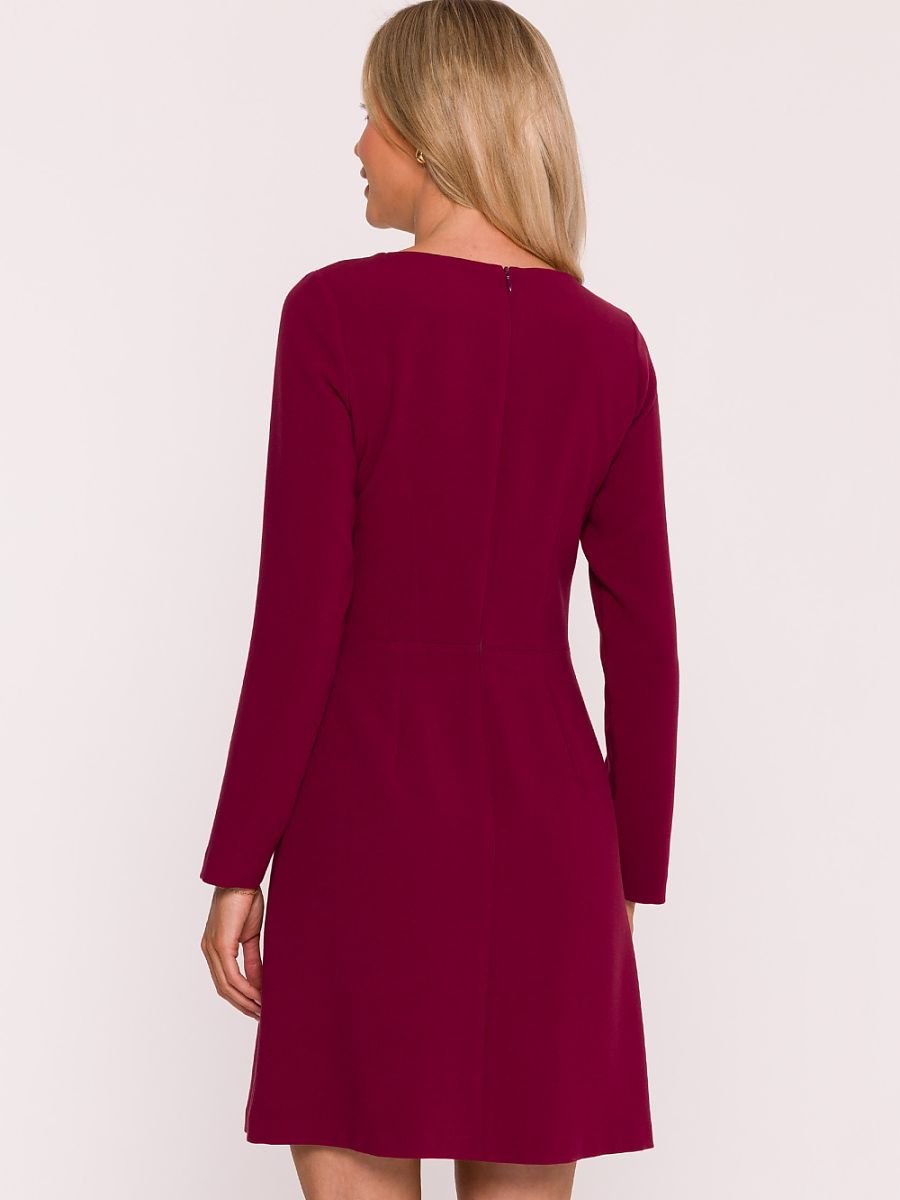Elegancka sukienka uszyta z gładkiej tkaniny o miękkim wykończeniu, która pięknie układa się na sylwetce. Klasyczny, zaokrąglony dekolt oraz długie rękawy nadają jej ponadczasowy charakter. Dopasowana góra subtelnie podkreśla talię, zaakcentowaną dodatkowymi patkami z ozdobnymi złotymi guzikami. Dół w kształcie delikatnej litery A lekko rozszerza się ku dołowi, tworząc trapezowy fason, który łączy elegancję z komfortem noszenia. Kryty zamek z tyłu zapewnia wygodę i estetyczne wykończenie, a długość przed kolano czyni tę sukienkę idealną zarówno na spotkania biznesowe, jak i bardziej formalne okazje. Zaprojektowano i uszyto w Polsce.