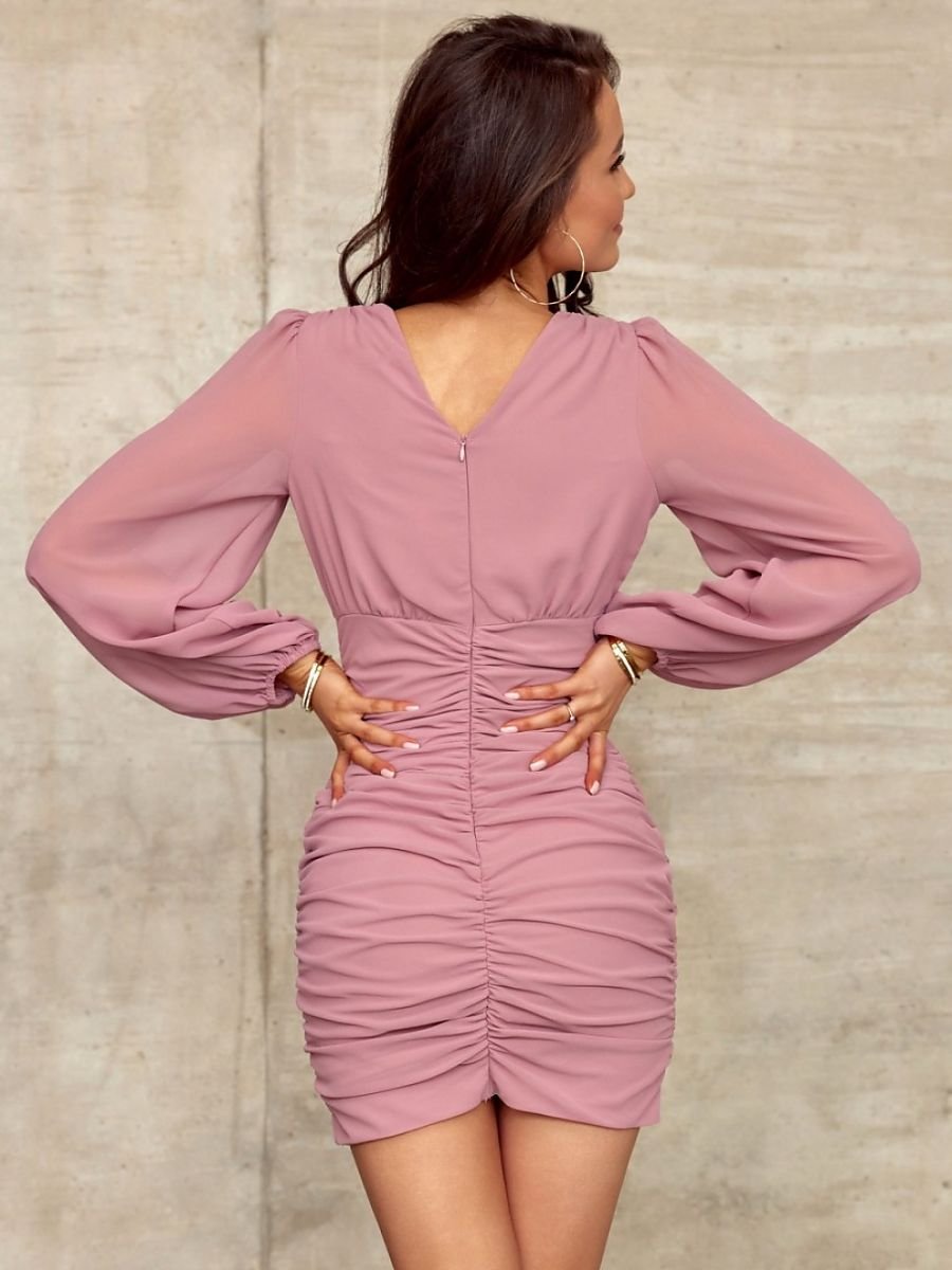 Wyjątkowa mini sukienka z pewnością przykuje uwagę na każdej okazji. Góra sukienki to dekolt w kształcie litery V na zakładkę, który także delikatnie uwydatnia plecy. Długie, bufiaste rękawy nadające całości klasy i szyku, są zakończone elastyczną gumką. Odcięcie pod biustem podkreśla i wysmukla talię, a umieszczone drapowanie uwydatnia kształt sylwetki. Dolna część sukienki to dopasowana spódnica charakteryzująca się modnym marszczeniem. Jej długość sięgająca powyżej kolan oraz marszczenia dodają delikatności i subtelności. Całość sukienki zapinana jest na kryty zamek błyskawiczny z tyłu sukienki, co ułatwia jej zakładanie. Sukienka Sarah posiada podszewkę. Ten model sukienki to doskonała propozycja jako kompletna stylizacja, która idealnie sprawdzi się na różne uroczystości. Produkt jest wyprodukowany i uszyty w Polsce.