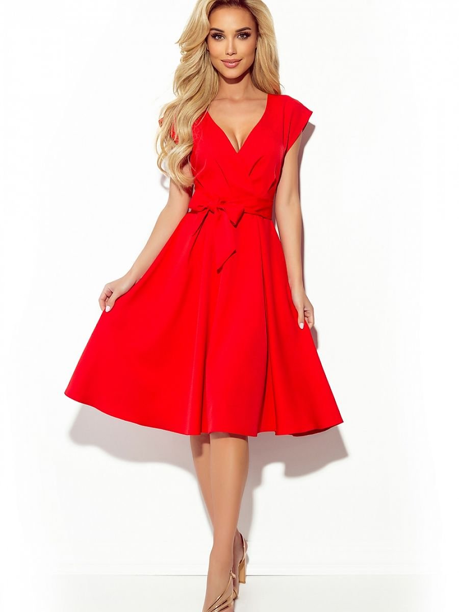 Rozkloszowana sukienka z kopertowym dekoltem i paskiem. Uszyta z przyjemnego w dotyku materiału. Sukienka w kolorze czerwonym. Marka numoco. Produkcja polska.