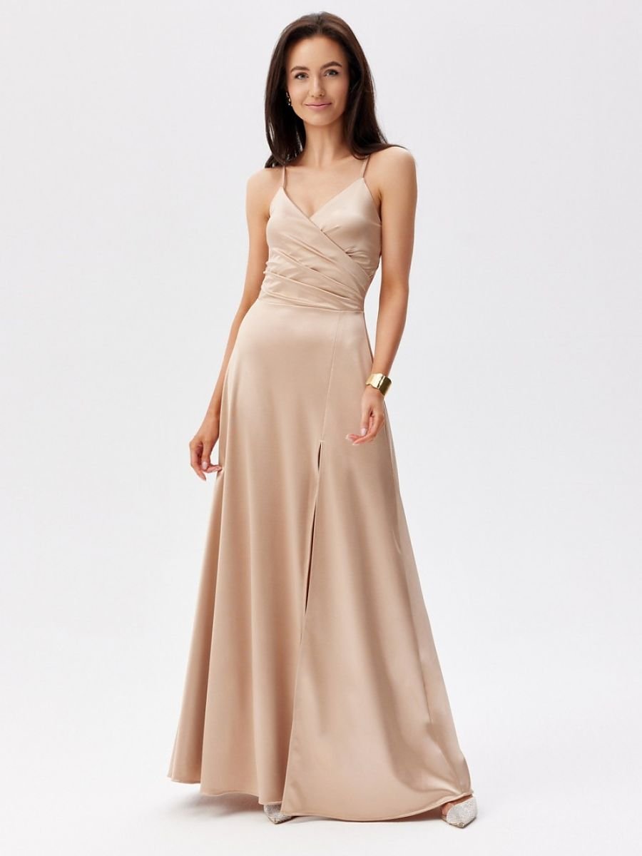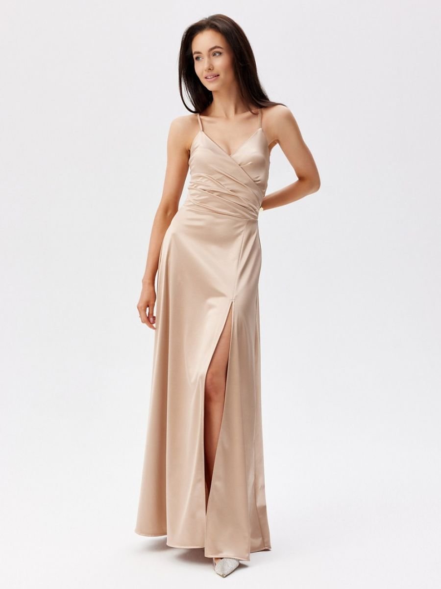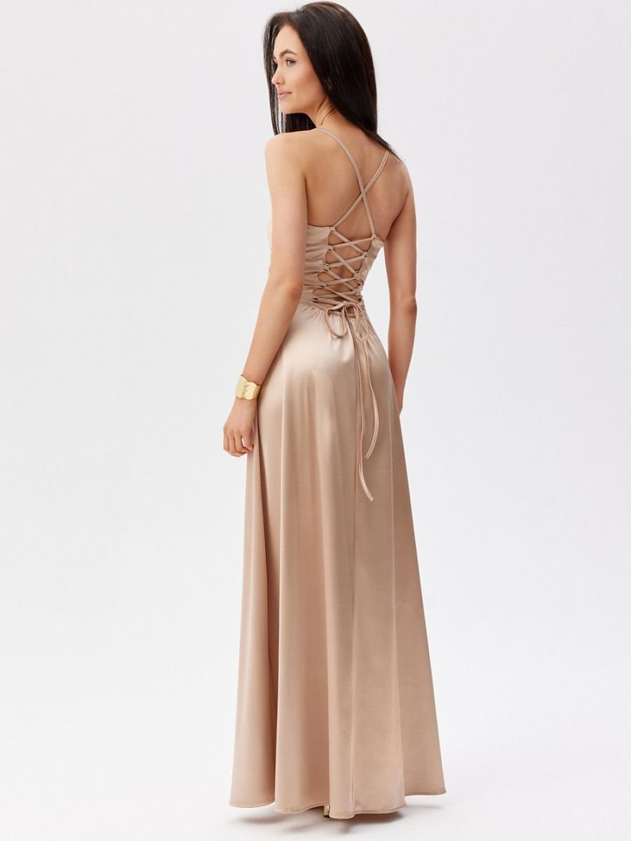 Zwiewna sukienka maxi na cienkich ramiączkach z kopertową górą i subtelnie rozkloszowanym dołem z efektownym rozcięciem na nodze. Model bez podszewki, z dekoracyjnym sznurowaniem na plecach, które pozwala na indywidualne dopasowanie do sylwetki.