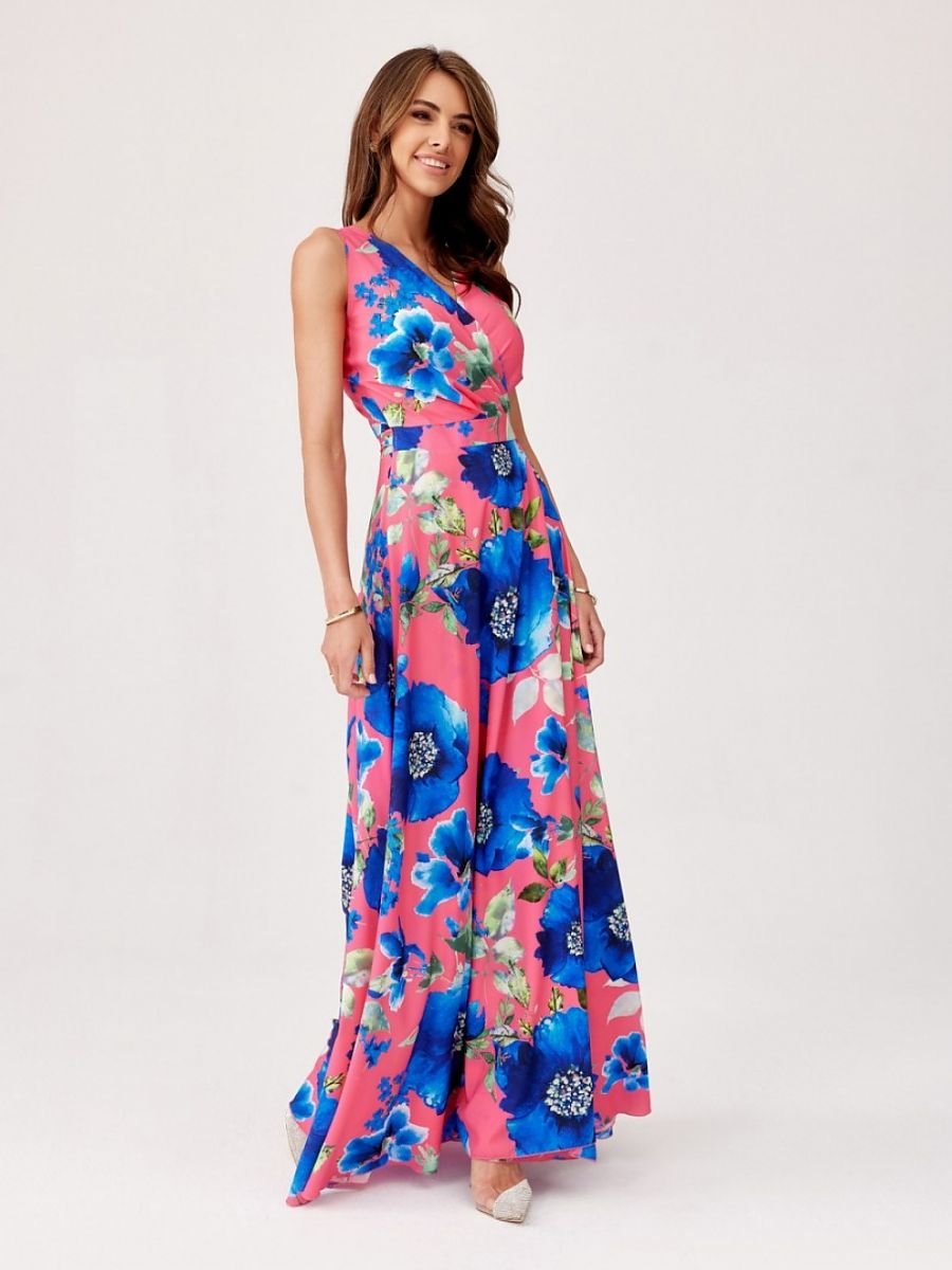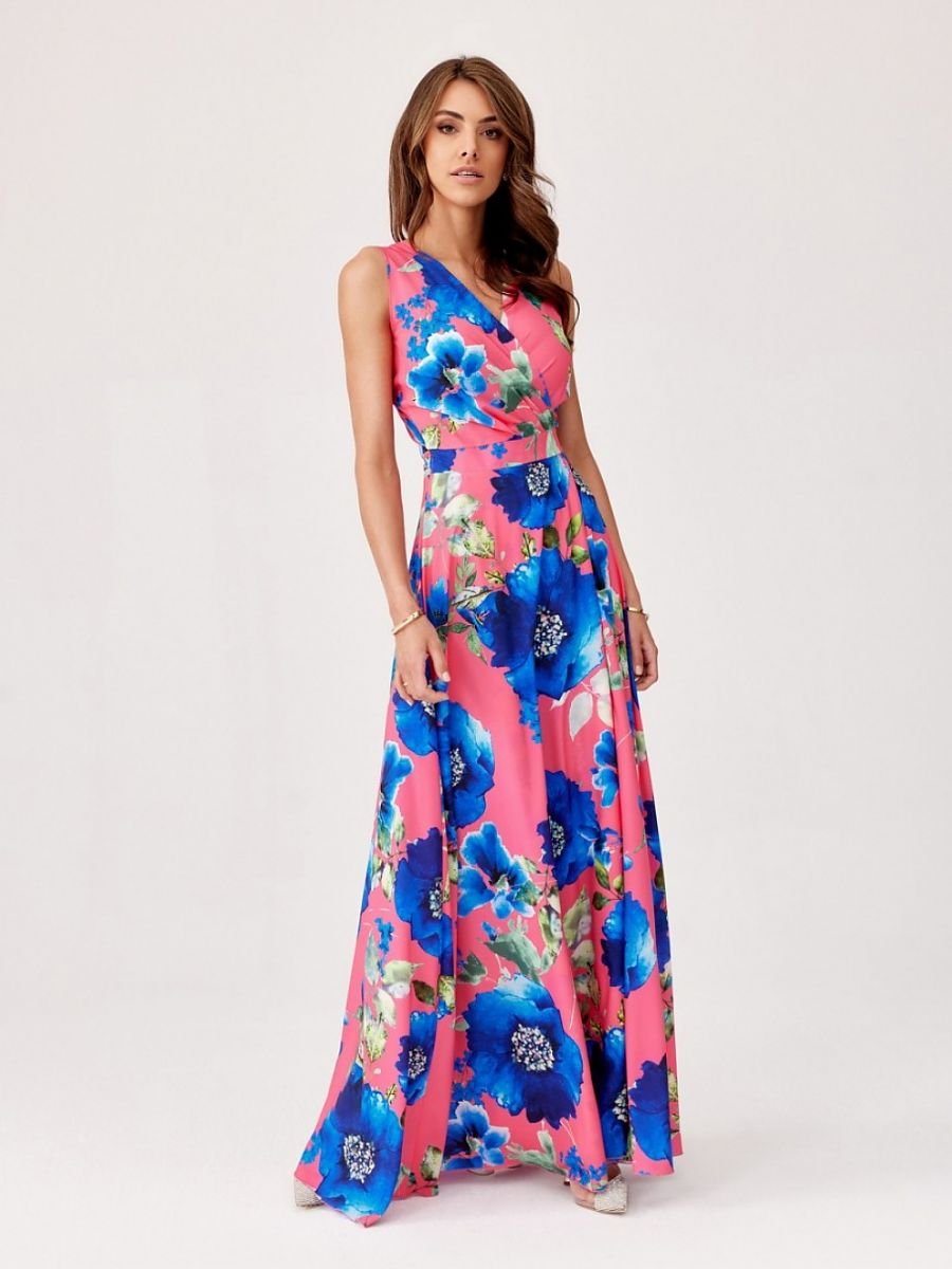Sukienka została ozdobiona kwiatowym wzorem, który dodaje całości lekkości i delikatności. Dekolt sukienki jest zaprojektowany na zakładkę, co sprawia, że sukienka wygląda bardzo subtelnie i elegancko. Zwężenie w talii nadaje sukience kobiecego kształtu, a z tyłu przechodzi w wiązaną uroczą kokardę. Sukienka nie ma podszewki. Grube ramiączka nadają sukience subtelnej elegancji i klasyczności. Spódnica kreacji jest umiejętnie przekładana, przy czym nie odkrywa nóg, a jednocześnie całość się idealnie układa na sylwetce. Produkt jest wyprodukowany i uszyty w Polsce.