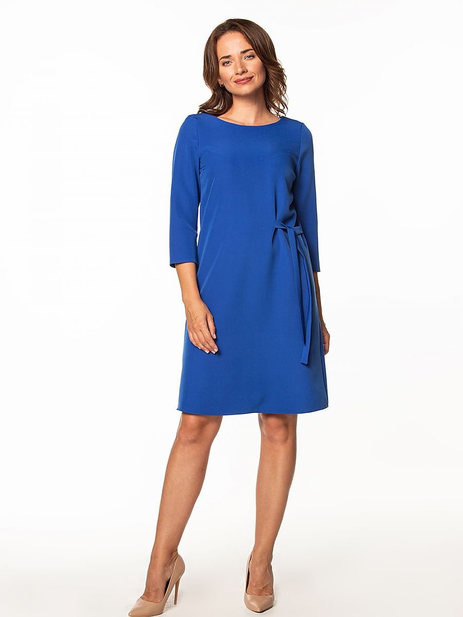 Prosta sukienka midi z wiązaniem w talii i rękawem 3/4.