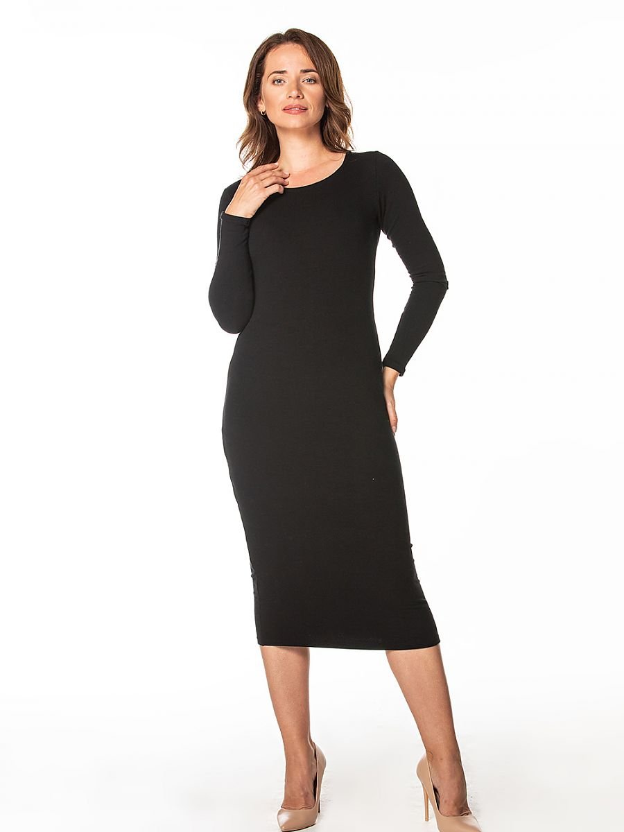 Długa, dopasowana i prosta sukienka z dzianiny bawełnianej z dekoltem w łódkę i długim rękawem.