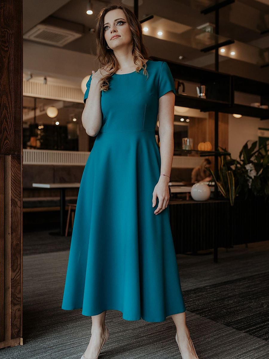 Długa sukienka z krótkim rękawkiem, zapinana na kryty zamek. Dół sukienka rozkloszowany. Propozycja idealna na wiele okazji.