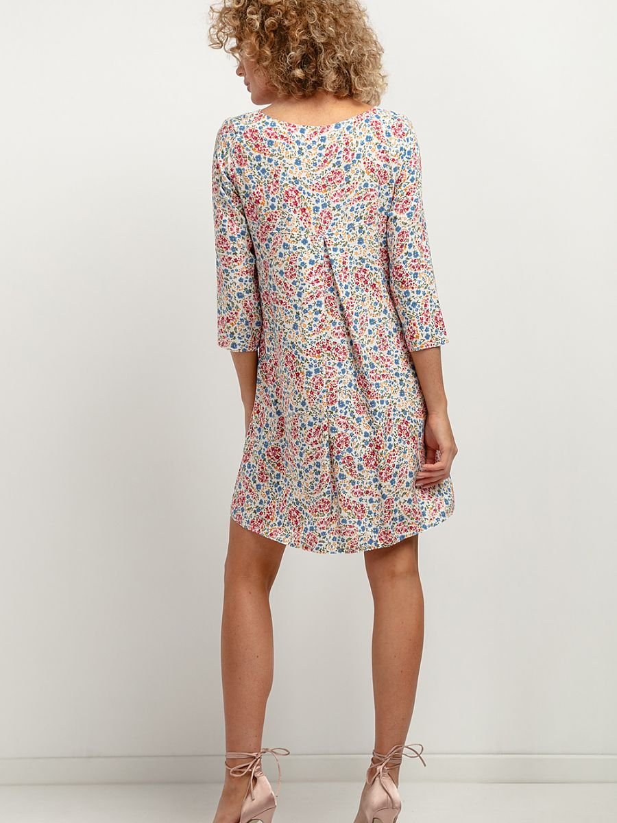 Prosta sukienka w ciekawe wzory z tkaniny wiskozowej. Posiada ona kontrafałdę na plecach i prosty rękaw za łokieć. Sukienka ma luźny fason, który nie skrępuje Twoich ruchów a dodatkowo zatuszuje ewentualne niedoskonałości figury. Sukienkę możesz założyć zarówno na co dzień jak i na specjalne okazje.