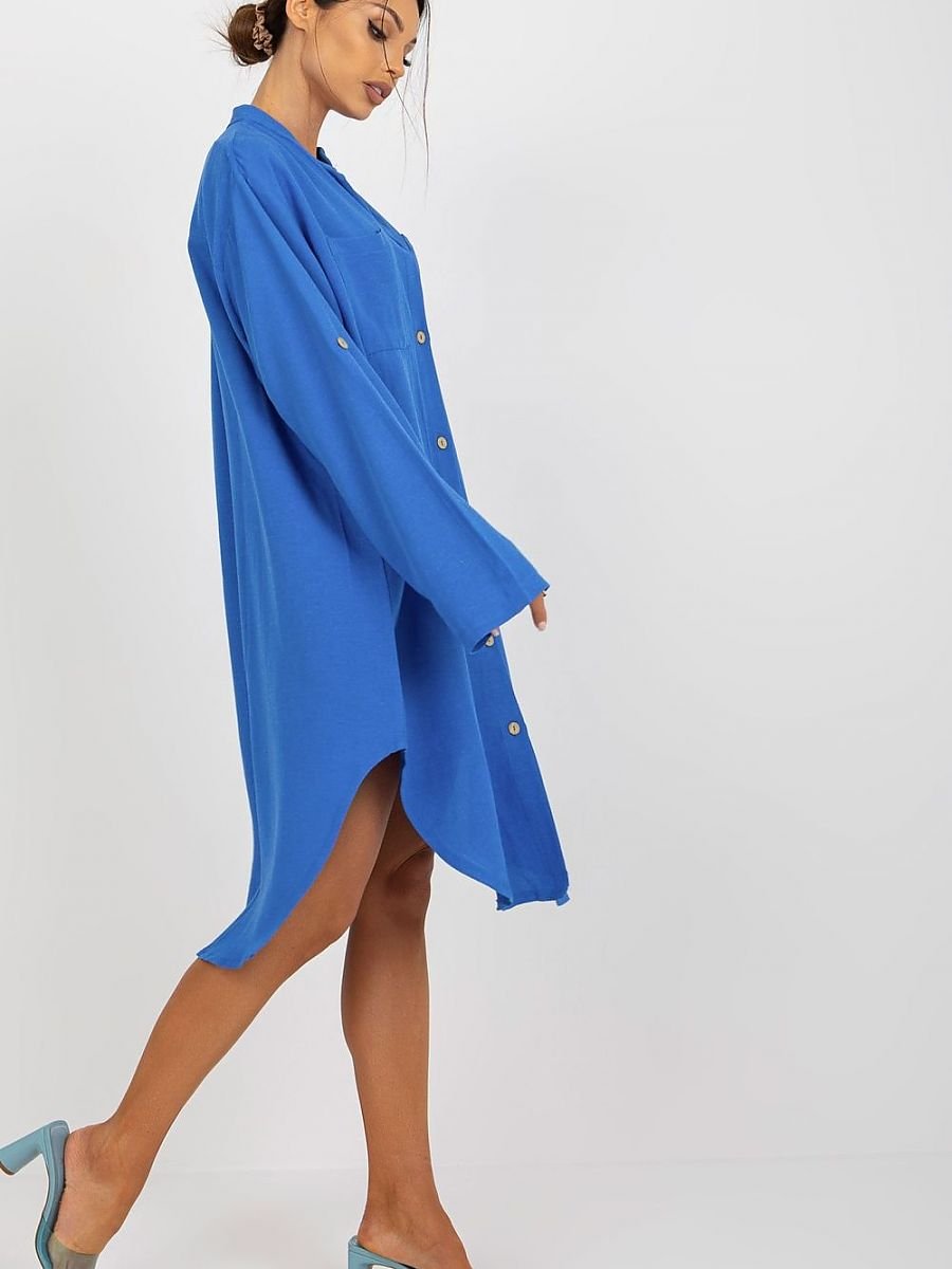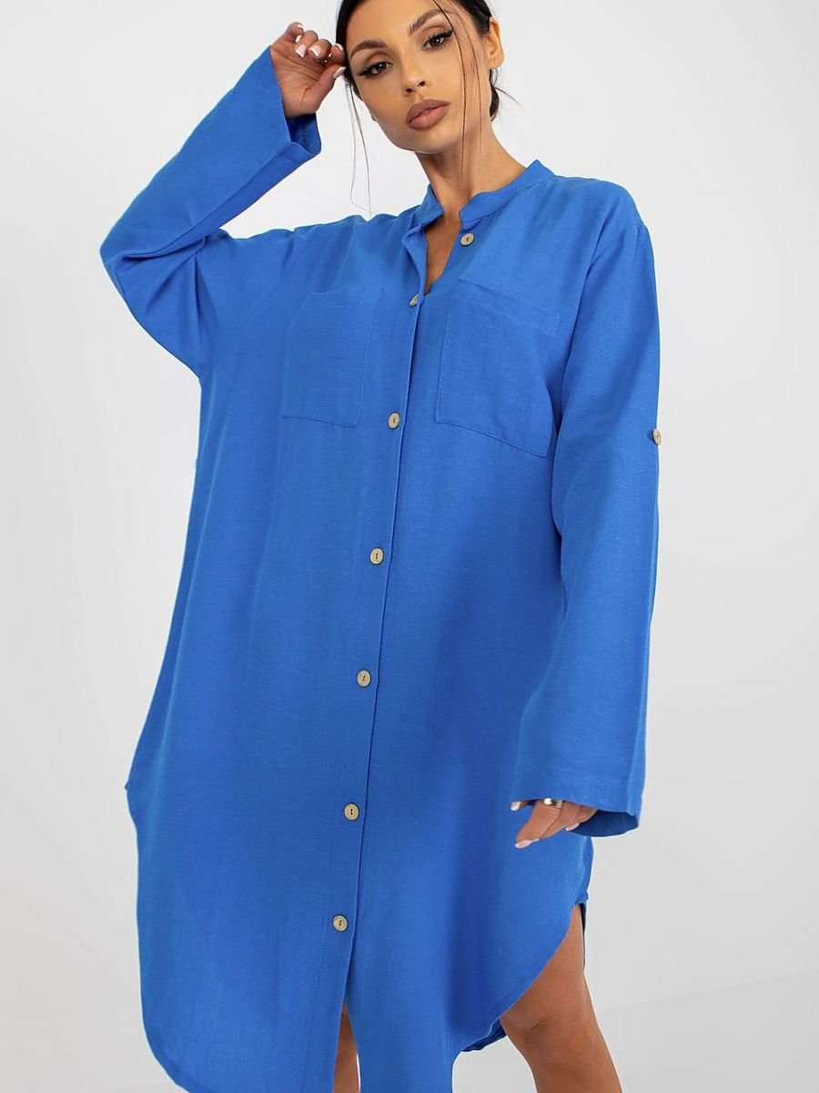 Sukienka o koszulowym kroju zapinana na guziki, z długim rękawem. Rękawy z możliwością podpięcia. Dół sukienki wykończony na półokrągło. Na przodzie dwie kieszenie.