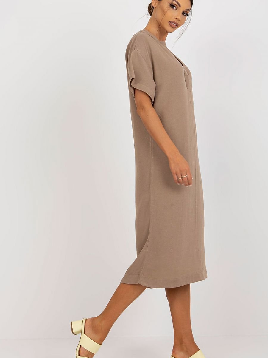 Sukienka o koszulowym kroju z krótkim rękawkiem oraz dekoltem w serek. Na jednym boku rozcięcie.