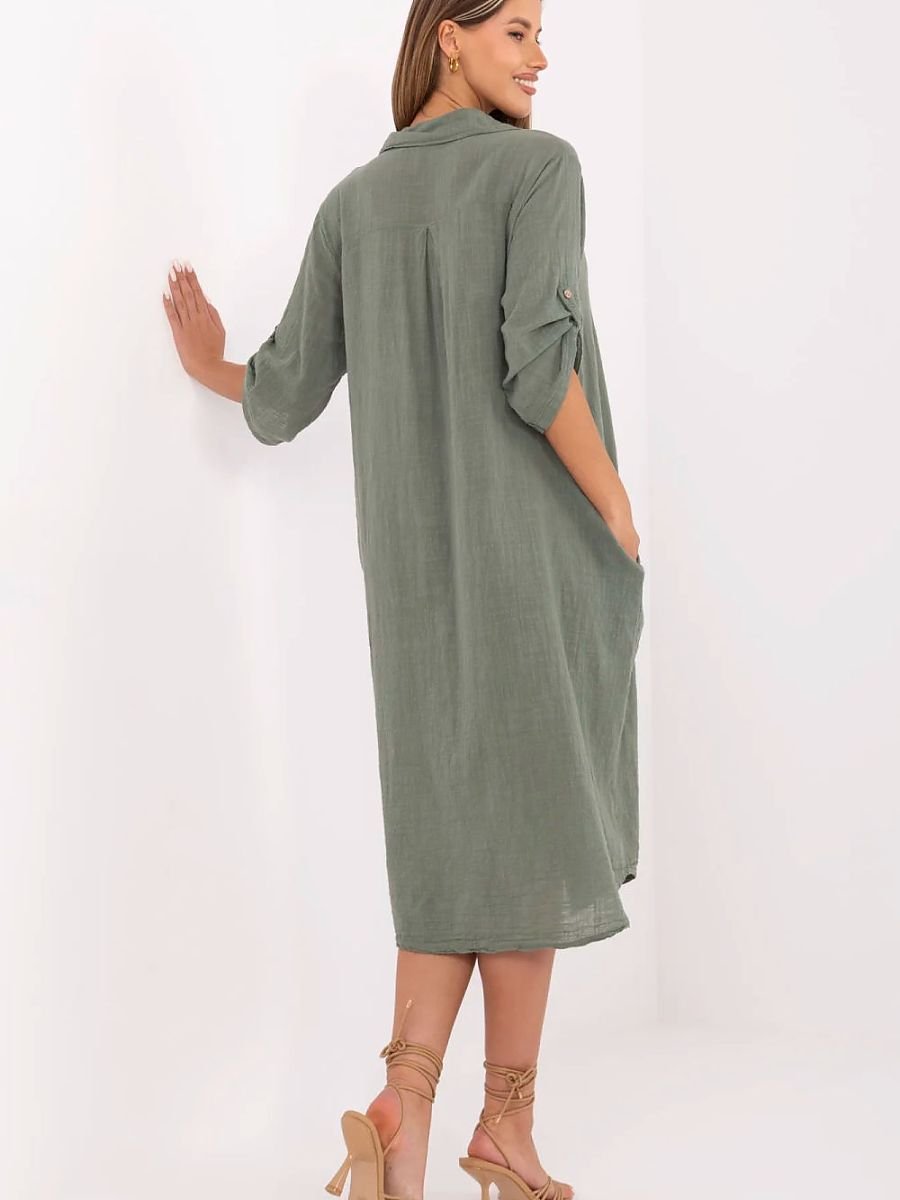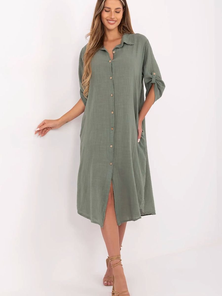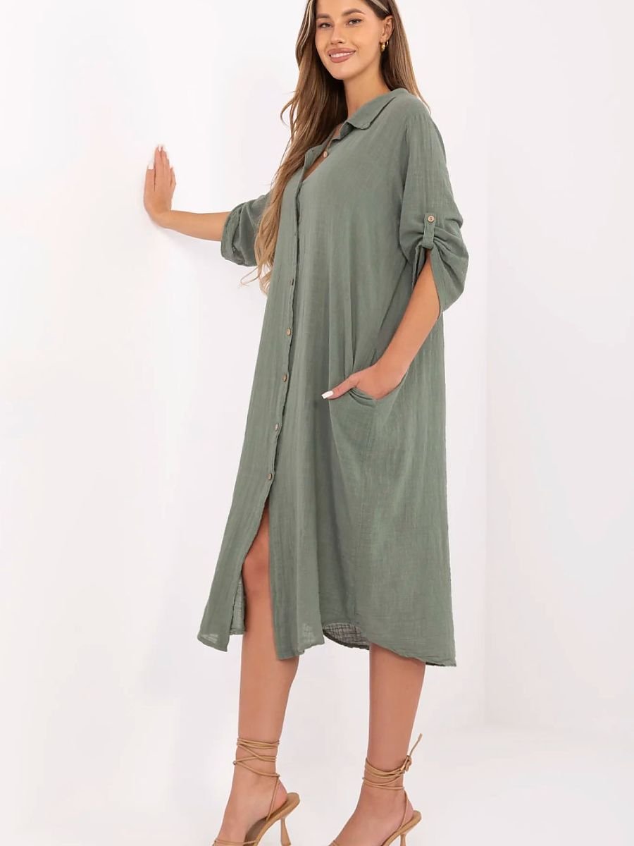 Letnia sukienka koszulowa o fasonie oversize to idealna propozycja na codzienne stylizacje. Wykonana z przewiewnej, naturalnej bawełny, zapewnia komfort noszenia nawet w cieplejsze dni. Model o długości midi charakteryzuje się klasycznym kołnierzykiem oraz zapięciem na guziki na całej długości. Rękawy 3/4 z możliwością podpięcia zwiększają funkcjonalność i pozwalają dopasować sukienkę do różnych temperatur. Gładki materiał i luźny krój nadają jej uniwersalnego charakteru, a wsuwane kieszenie ukryte w szwach bocznych to praktyczny detal, który podkreśla codzienny, swobodny styl tej sukienki.