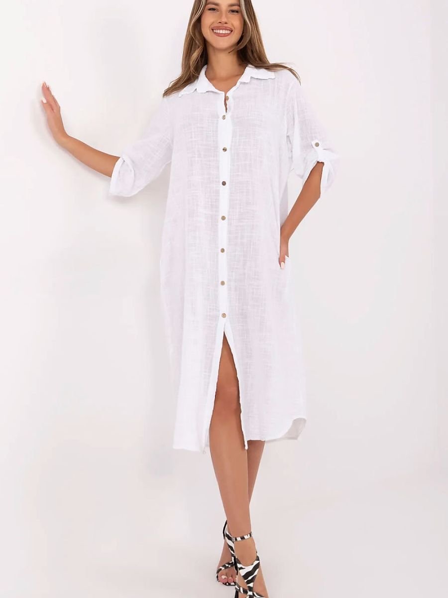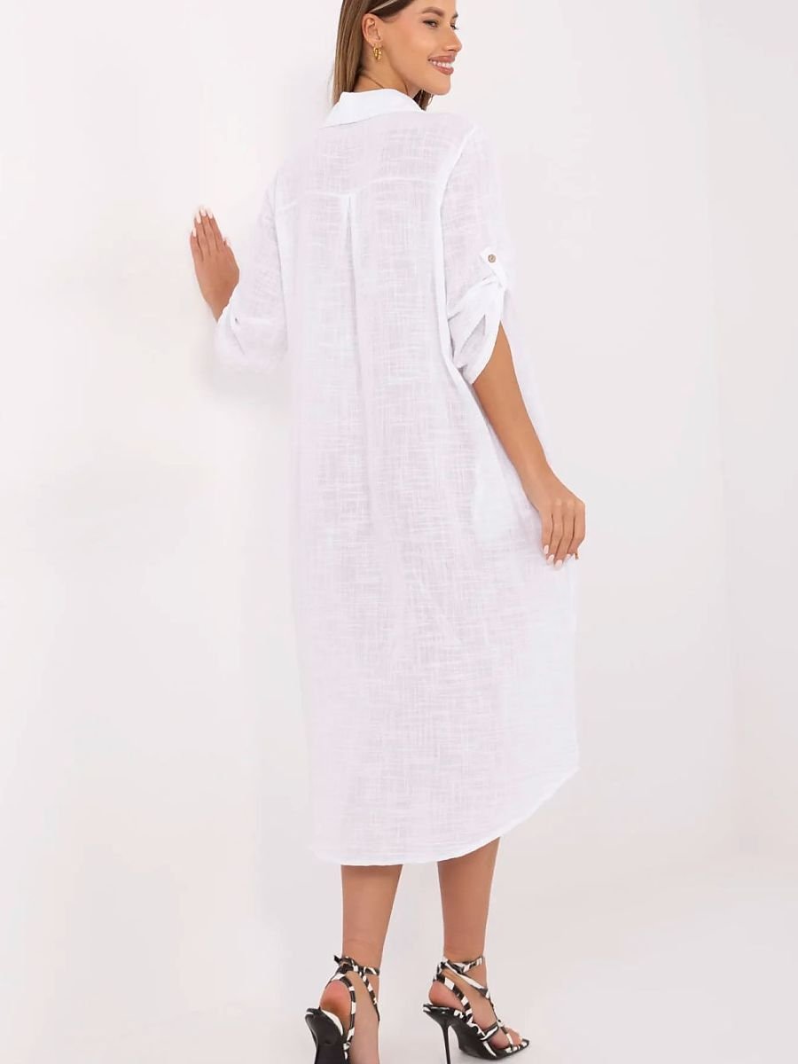 Letnia sukienka koszulowa o fasonie oversize to idealna propozycja na codzienne stylizacje. Wykonana z przewiewnej, naturalnej bawełny, zapewnia komfort noszenia nawet w cieplejsze dni. Model o długości midi charakteryzuje się klasycznym kołnierzykiem oraz zapięciem na guziki na całej długości. Rękawy 3/4 z możliwością podpięcia zwiększają funkcjonalność i pozwalają dopasować sukienkę do różnych temperatur. Gładki materiał i luźny krój nadają jej uniwersalnego charakteru, a wsuwane kieszenie ukryte w szwach bocznych to praktyczny detal, który podkreśla codzienny, swobodny styl tej sukienki.