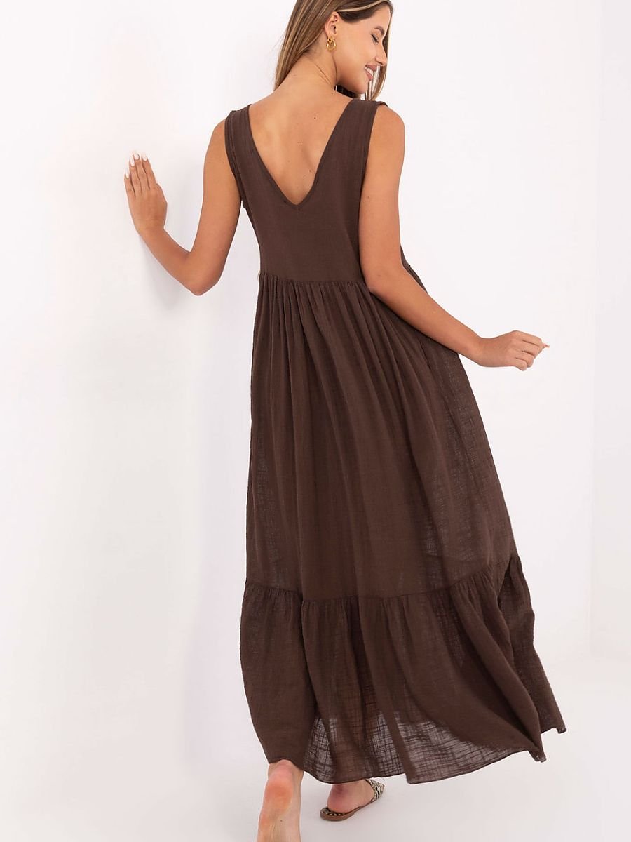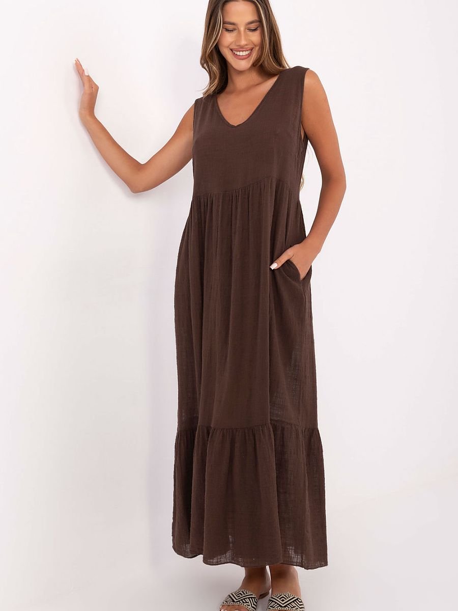Długa, letnia sukienka o rozkloszowanym fasonie to idealna propozycja na codzienne, ciepłe dni. Wykonana z naturalnej bawełny, zapewnia przewiewność i komfort noszenia nawet w największe upały. Model na szerokich ramiączkach z dekoltem w serek subtelnie podkreśla górną część sylwetki, a luźno opadający dół zakończony falbaną dodaje lekkości i kobiecego uroku. Sukienka nie posiada zapięcia, co ułatwia jej zakładanie i gwarantuje wygodę przez cały dzień. Gładki wzór sprawia, że jest uniwersalna i łatwa do stylizowania, a praktyczne kieszenie w szwach bocznych dodają funkcjonalności. To must-have w letniej garderobie, idealna na spacery, zakupy czy spotkania na świeżym powietrzu.