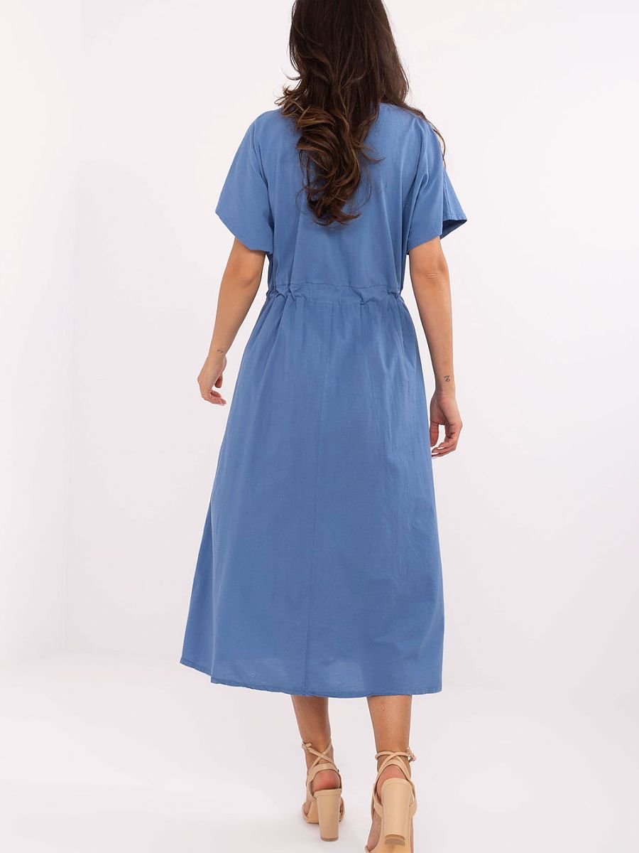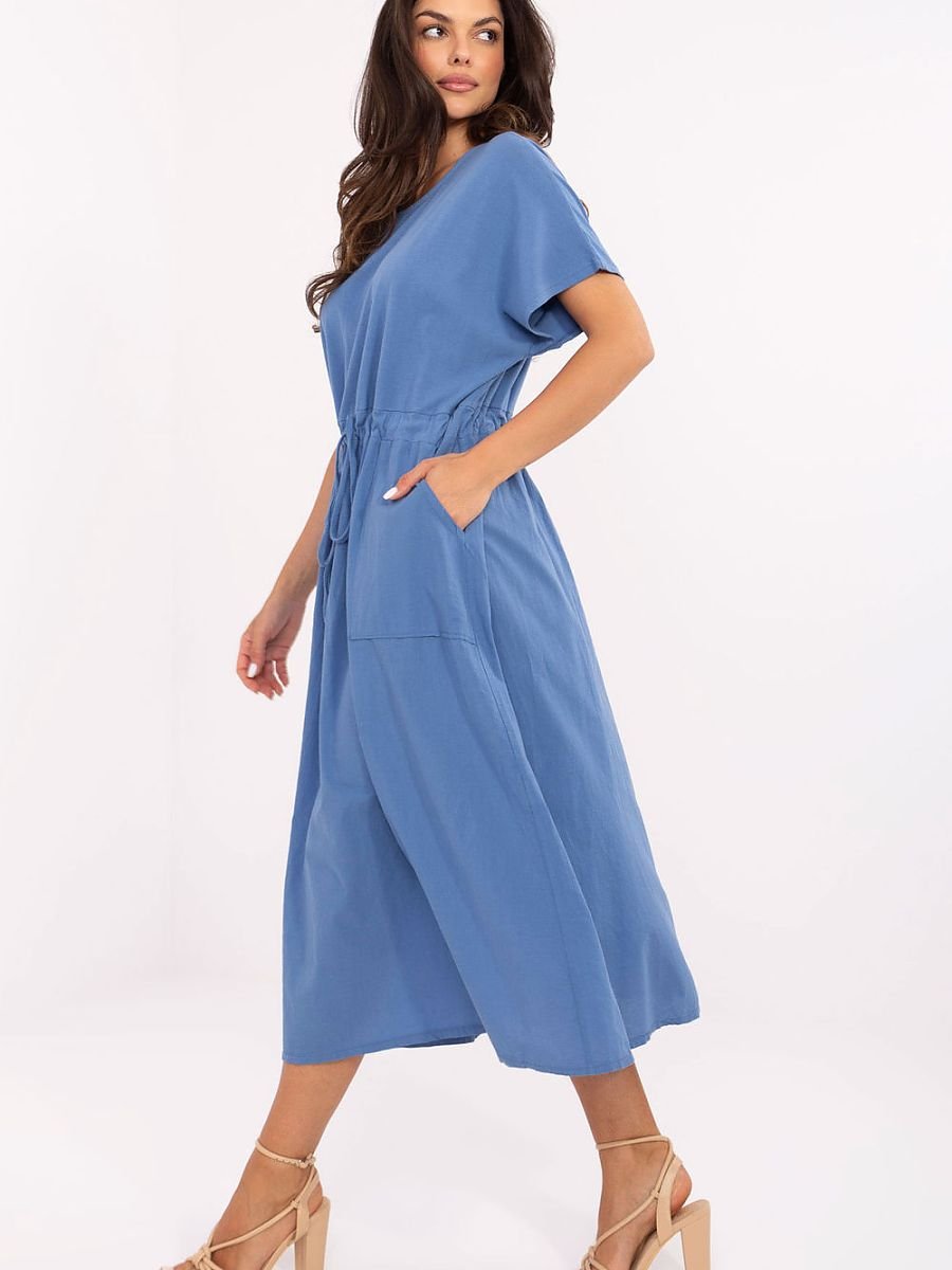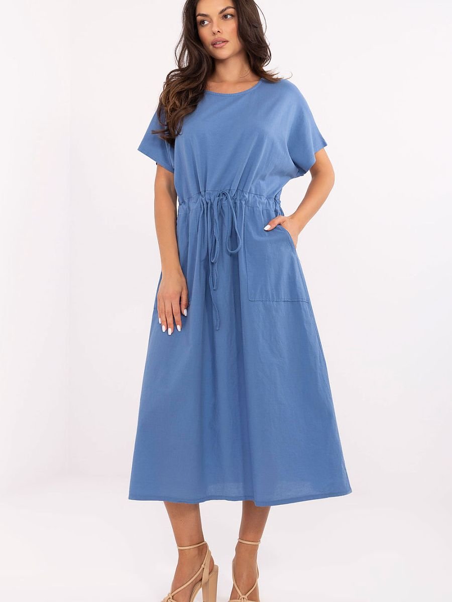 Przewiewna i wygodna letnia sukienka o rozkloszowanym fasonie, uszyta z naturalnej bawełny. Gładka tkanina zapewnia komfort noszenia i świetnie sprawdza się w codziennych stylizacjach. Model o długości midi, z krótkim rękawem i klasycznym, okrągłym dekoltem. W talii znajduje się wiązanie, które pozwala podkreślić sylwetkę i dopasować sukienkę do figury. Dodatkowym atutem są praktyczne, wsuwane kieszenie, które dodają funkcjonalności i luzu. To idealna propozycja na letnie dni na spacer, zakupy, do pracy lub spotkanie z przyjaciółmi. Uniwersalna i ponadczasowa, będzie świetną bazą do wielu stylizacji.
