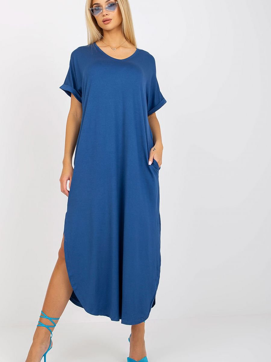 Sukienka z krótkim rękawkiem, po bokach kieszenie wsuwane. Dół zaokrąglony, z rozcięciami.